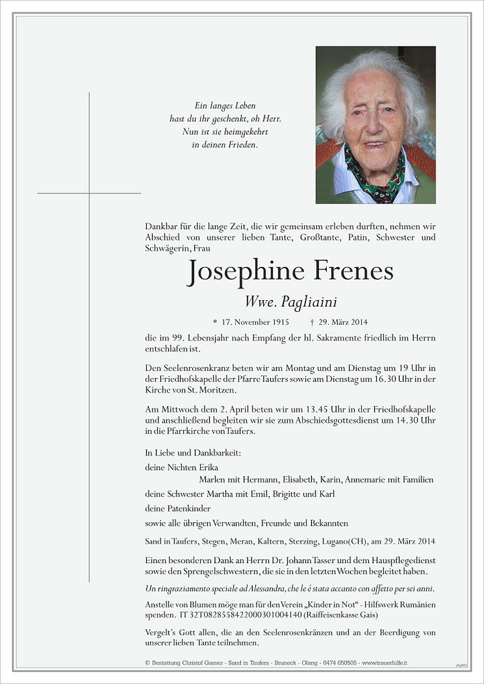 Anstelle von Blumen möge man für den Verein „Kinder in Not“ - Hilfswerk Rumänien spenden. IT 32T0828558422000301004140 (Raiffeisenkasse Gais)