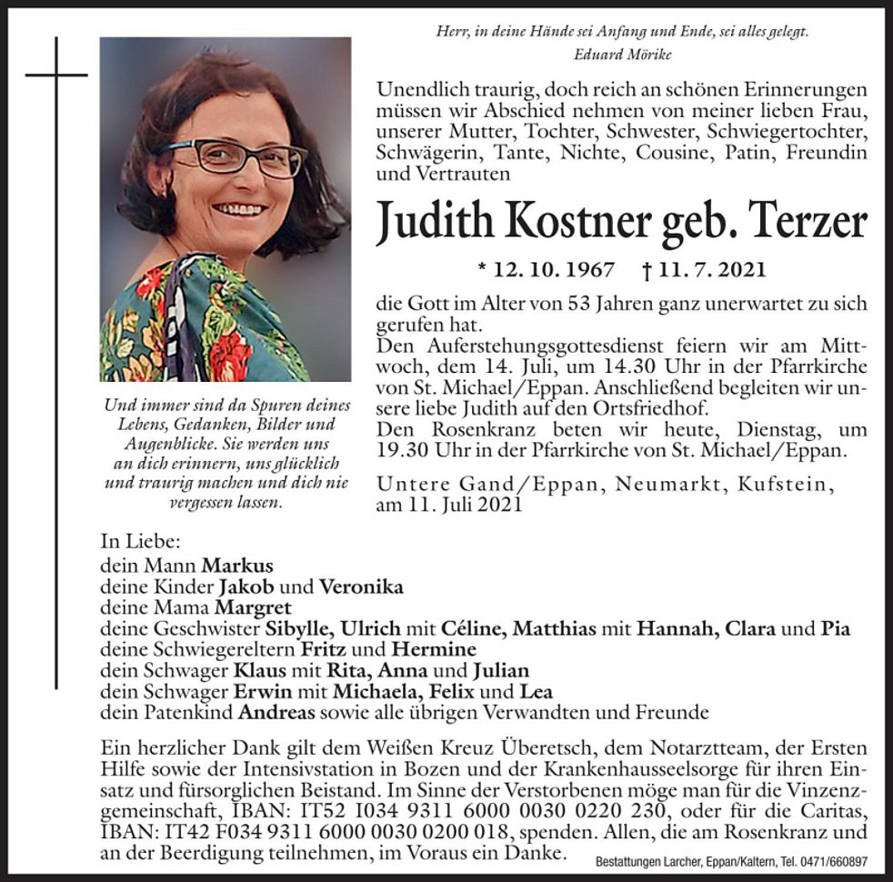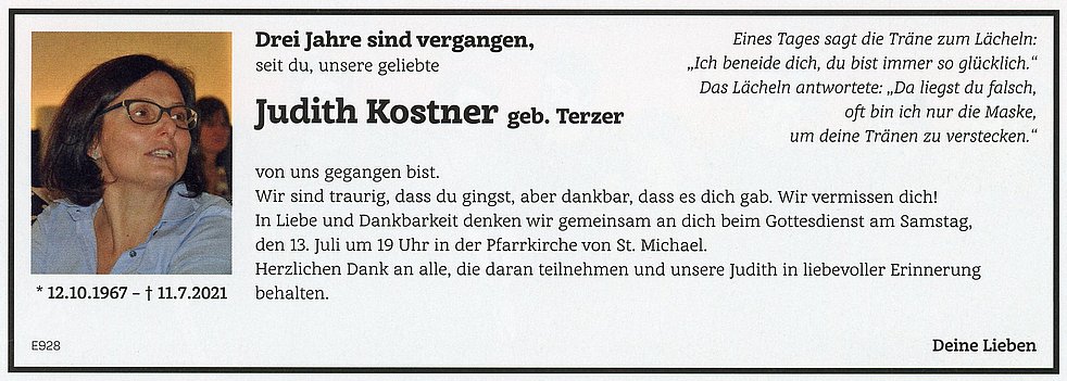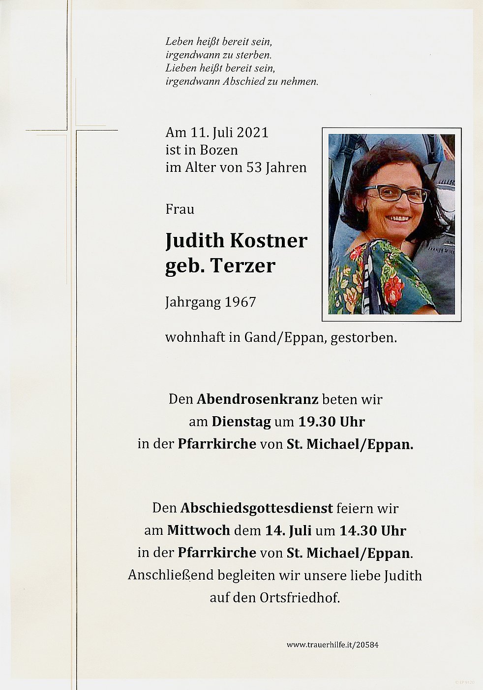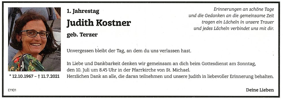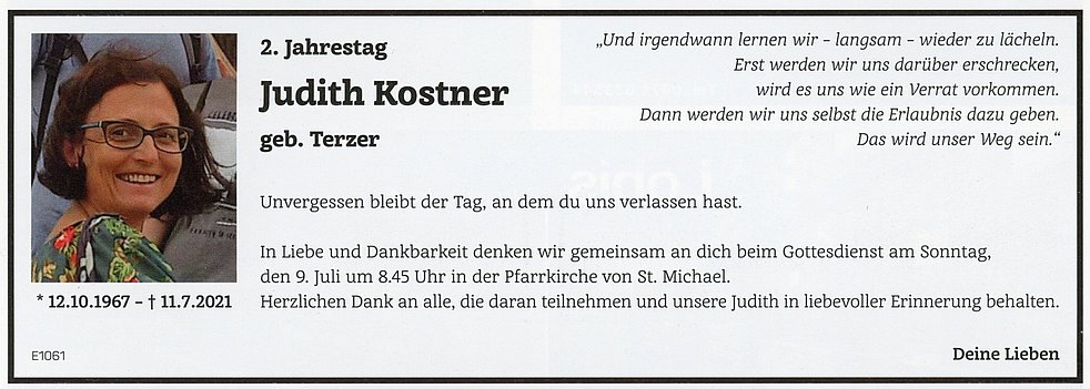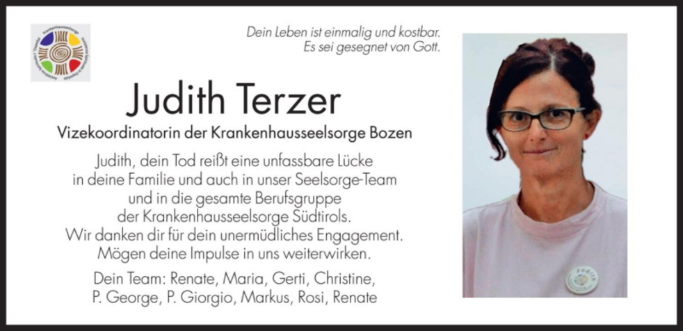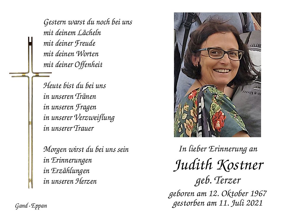 Den Auferstehungsgottesdienst feiern wir am Mittwoch, dem 14. Juli um 14.30 Uhr in der Pfarrkirche von St. Michael/Eppan, anschließend begleiten wir unsere liebe Judith auf den Ortsfriedhof.