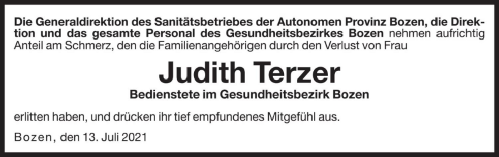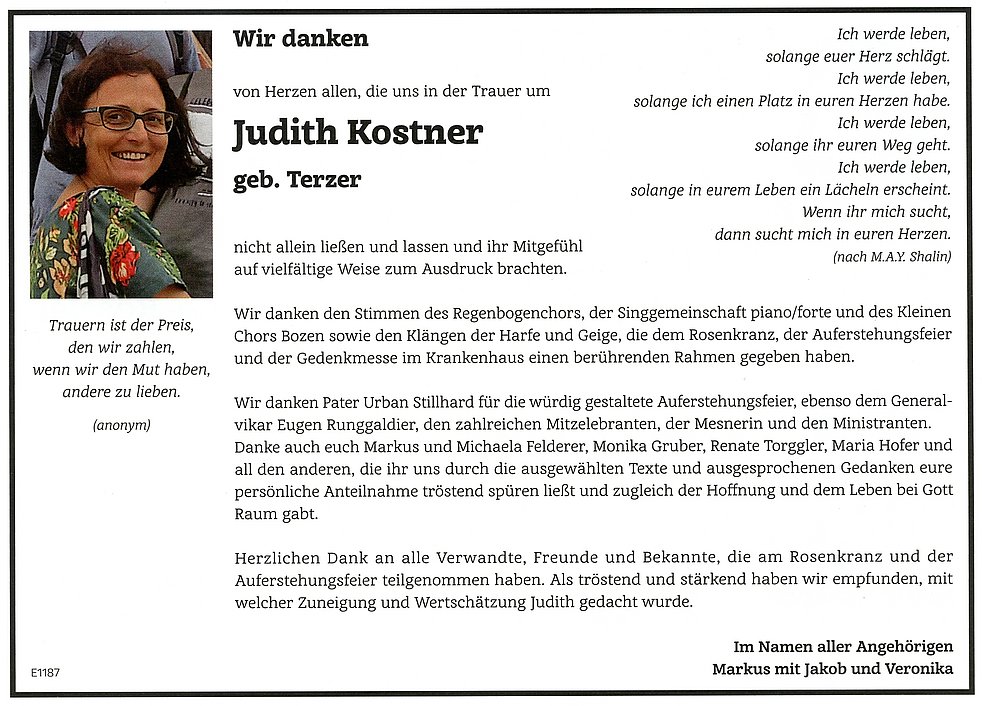 Im Sinne der Verstorbenen möge man für die Vinzenzgemeinschaft IBAN: IT 52 I 03493 11600 000300220230 oder an die Caritas IBAN: IT42F0349311600000300200018 spenden.