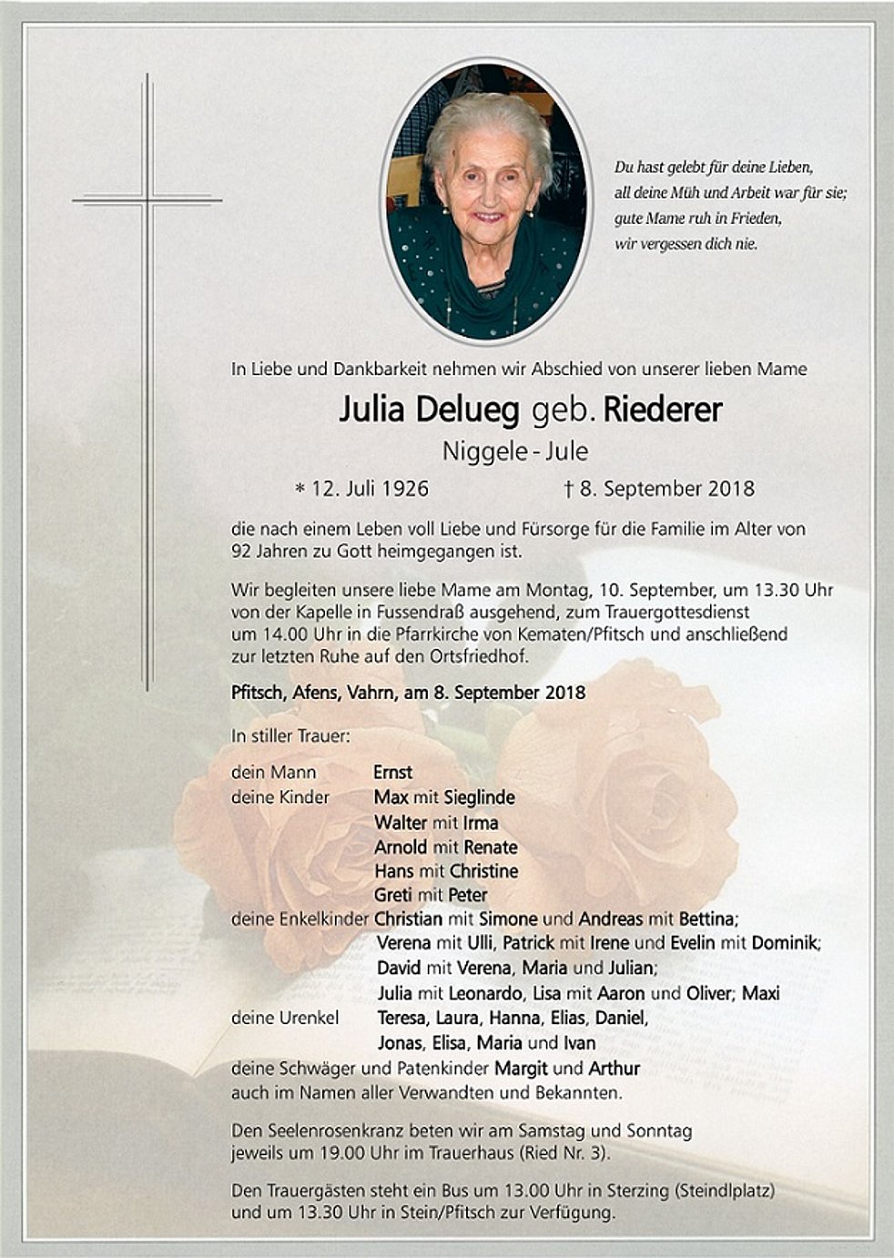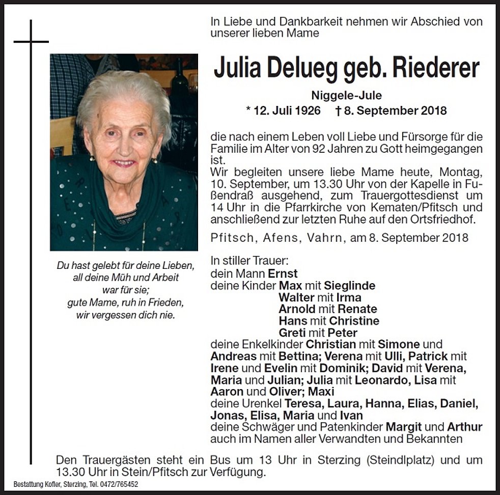 Wir begleiten unsere liebe Mame am Montag, 10. September, um 13.30 Uhr von der Kapelle in Fussendraß ausgehend, zum Trauergottesdienst um 14.00 Uhr in die Pfarrkirche von Kematen/Pfitsch und anschließend zur letzten Ruhe auf den Ortsfriedhof.