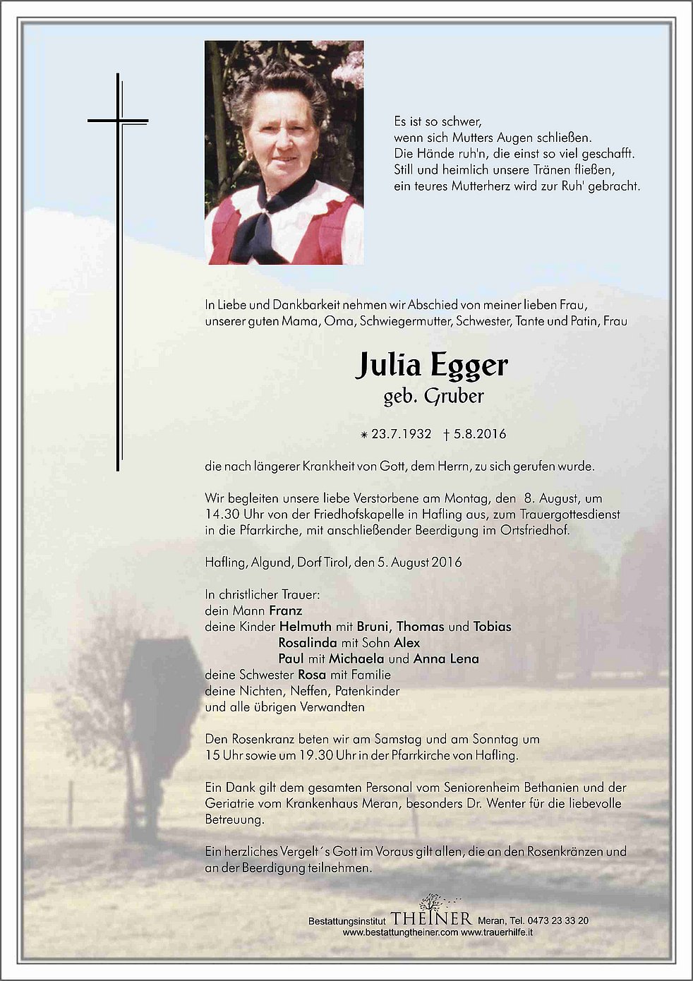 14.30 Uhr von der Friedhofskapelle in Hafling aus, zum Trauergottesdienst