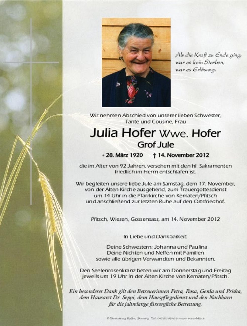 Wir begleiten unsere liebe Jule am Samstag, dem 17. November, von der Alten Kirche ausgehend, zum Trauergottesdienst um 14 Uhr in die Pfarrkirche von Kematen/Pfitsch