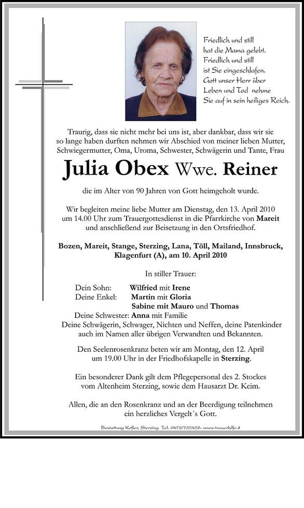 um 14.00 Uhr zum Trauergottesdienst in die Pfarrkirche von Mareit