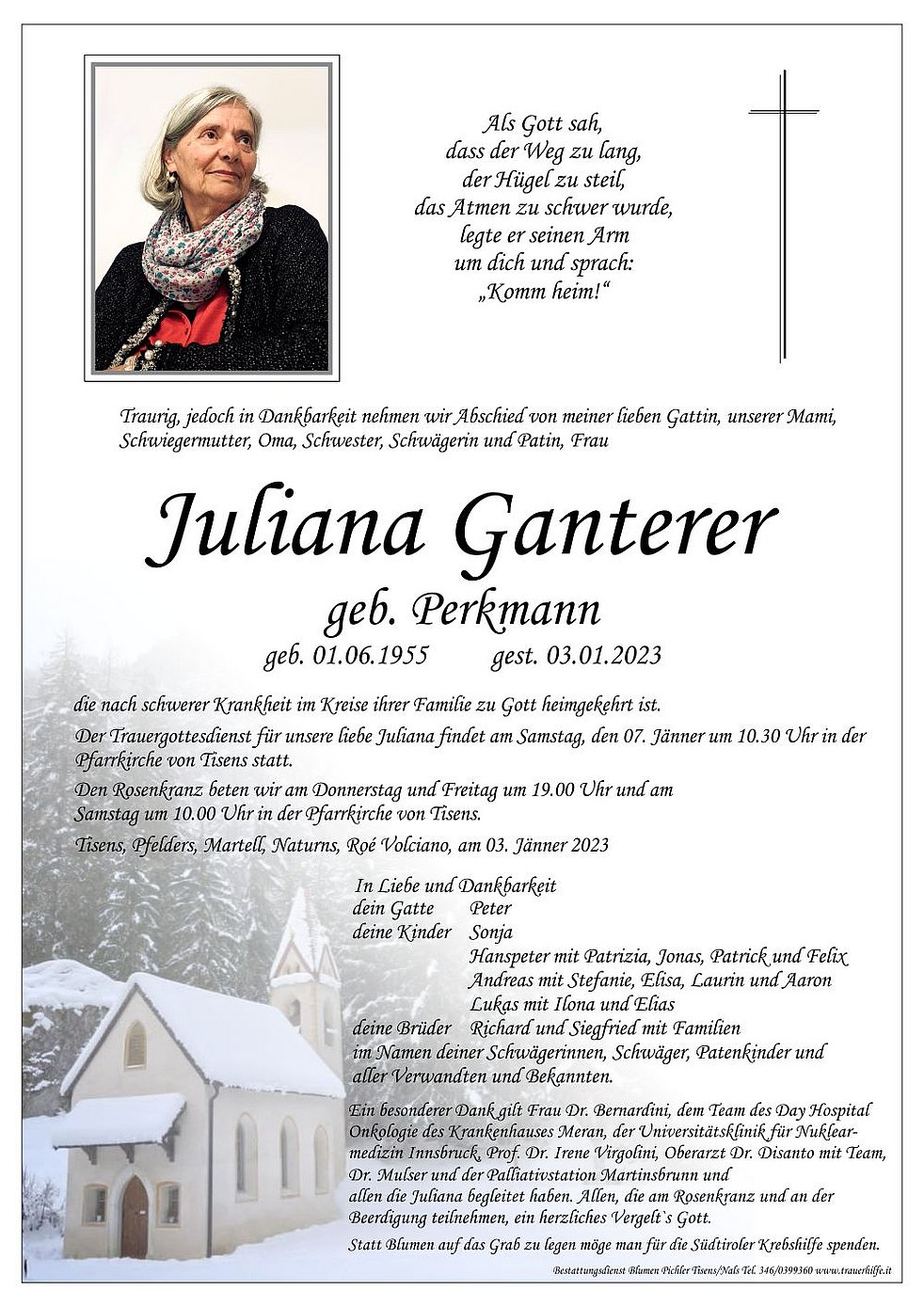 Der Trauergottesdienst für unsere liebe Juliana findet am Samstag, den 07. Jänner um 10.30 Uhr in der