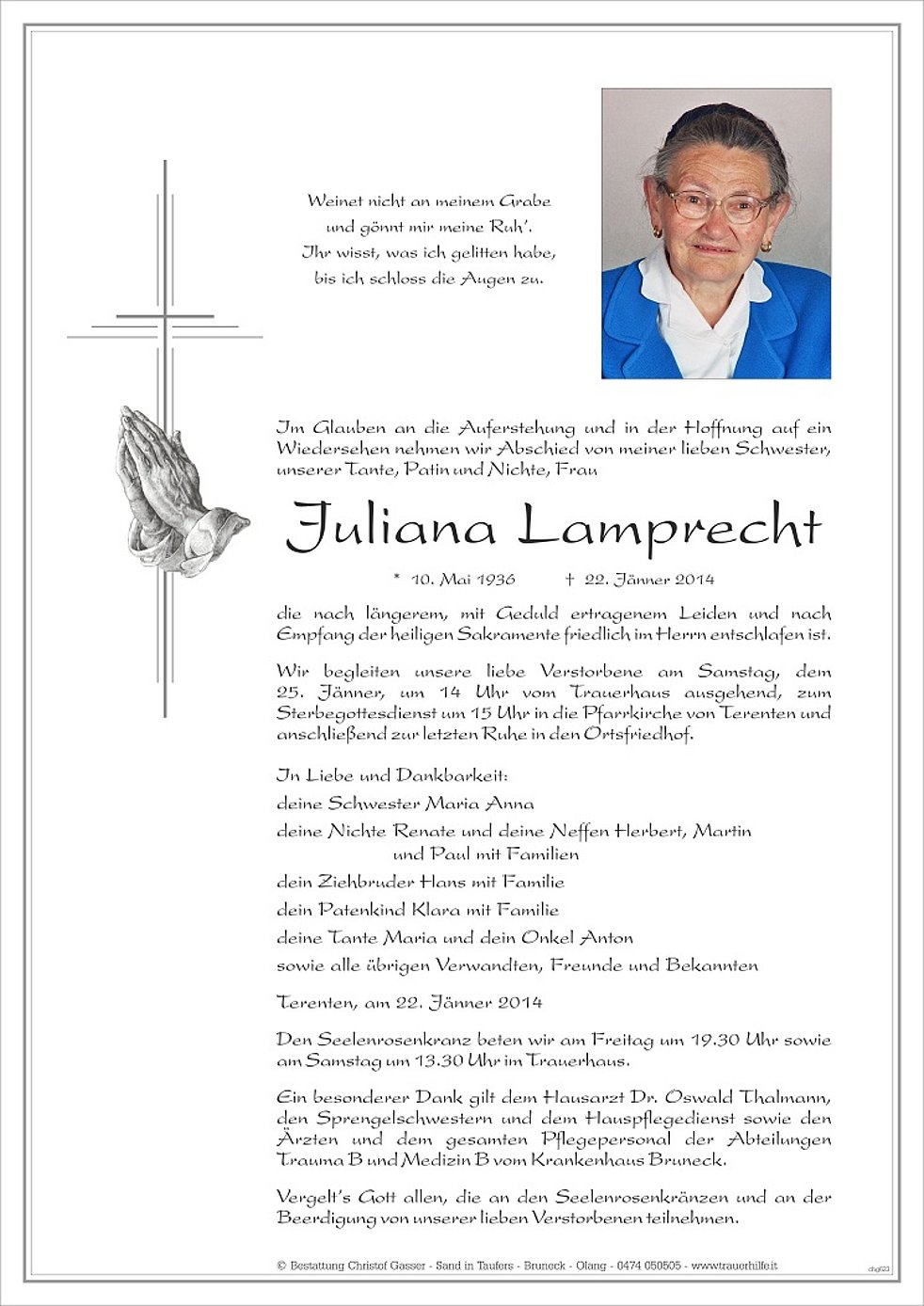 25. Jänner, um 14 Uhr vom Trauerhaus ausgehend, zum Sterbegottesdienst um 15 Uhr in die Pfarrkirche von Terenten und anschließend zur letzten Ruhe in den Ortsfriedhof.