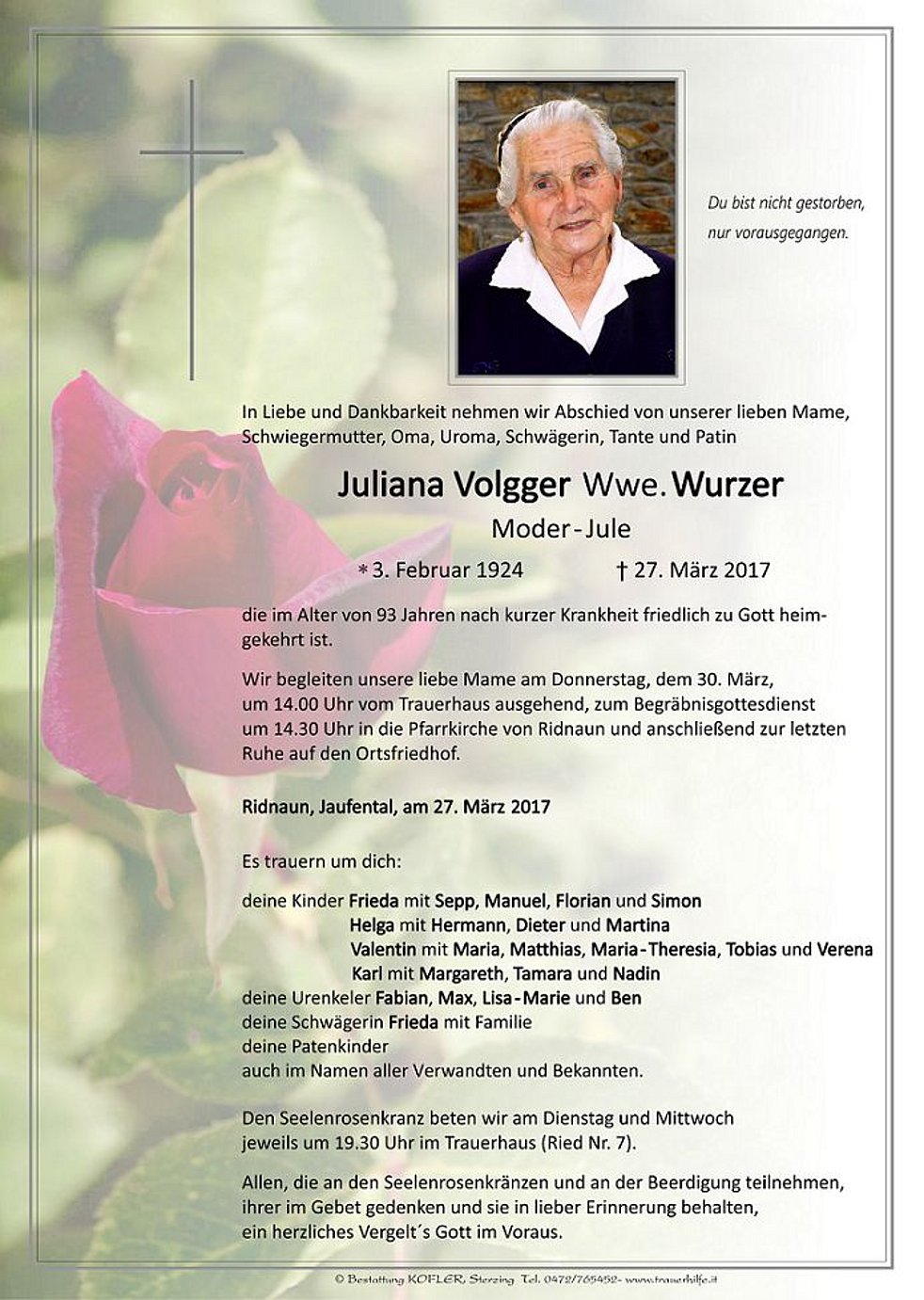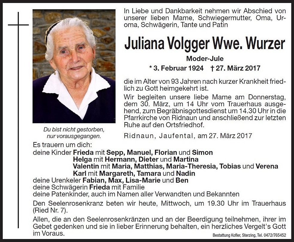 Wir begleiten unsere liebe Mame am Donnerstag, dem 30. März, um 14.00 Uhr vom Trauerhaus ausgehend, zum Begräbnisgottesdienst um 14.30 Uhr in die Pfarrkirche von Ridnaun und anschließend zur letzten Ruhe auf den Ortsfriedhof.