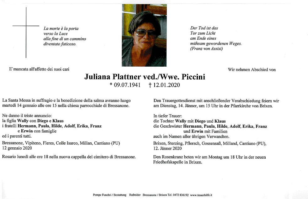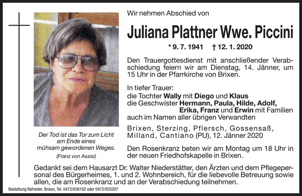 Den Trauergottesdienst mit anschließender Verabschiedung feiern wir am Dienstag, 14. Jänner, um 15 Uhr in der Pfarrkirche von Brixen.