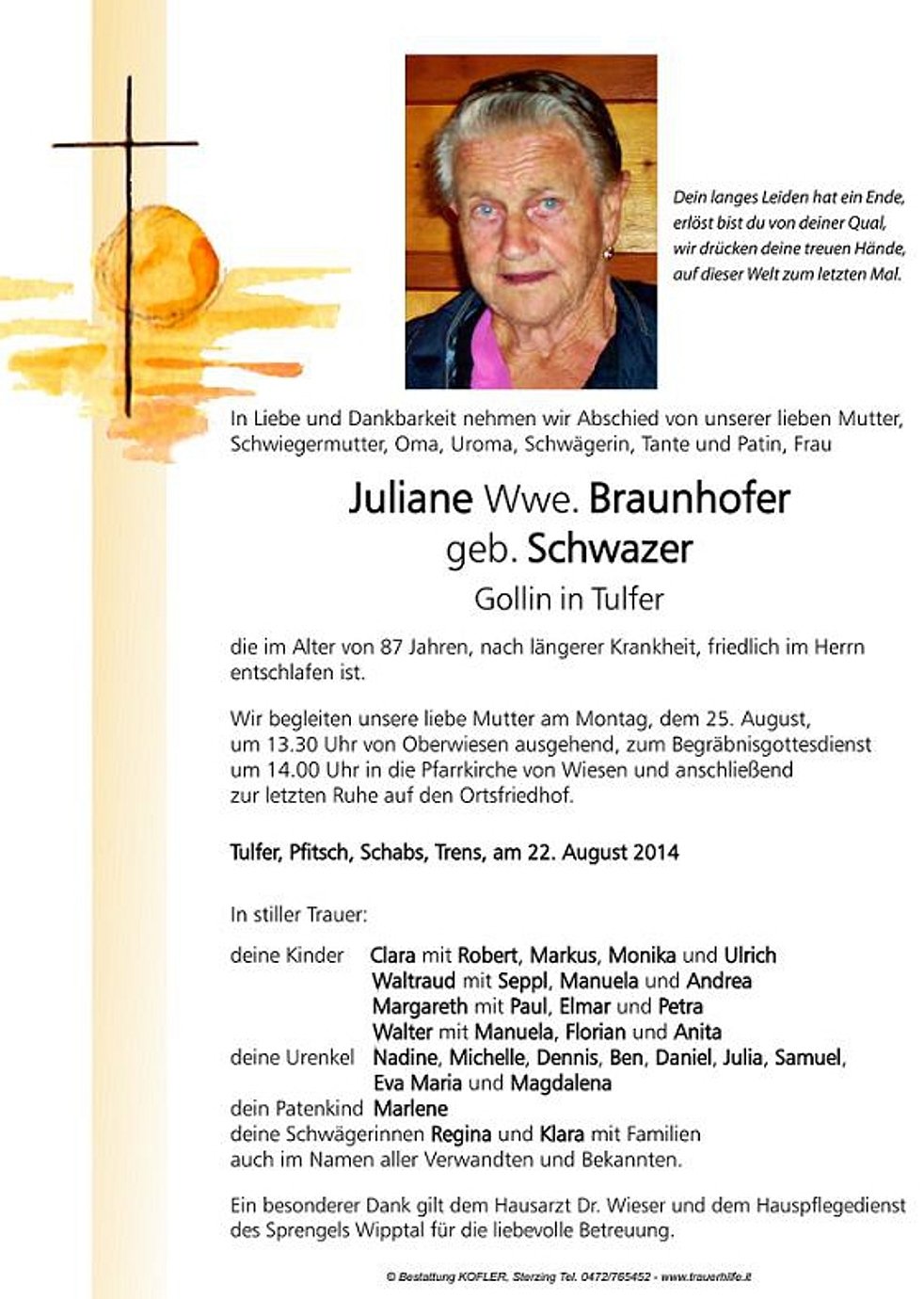 Ein besonderer Dank gilt dem Hausarzt Dr. Wieser und dem Hauspflegedienst
