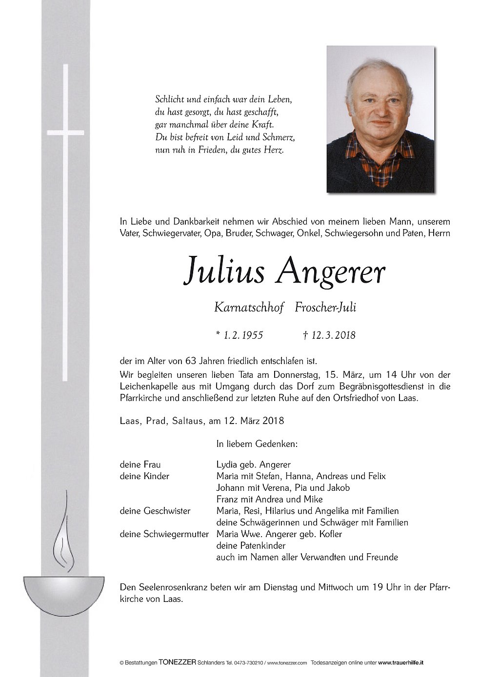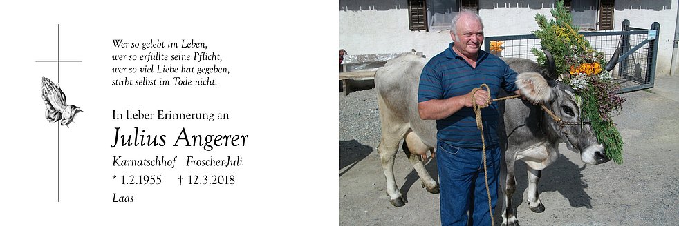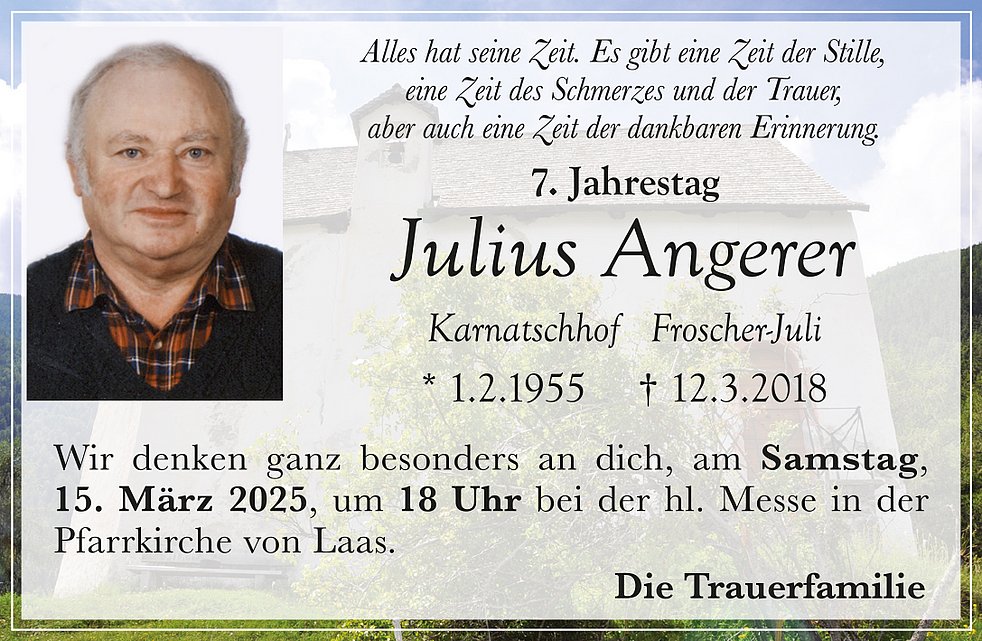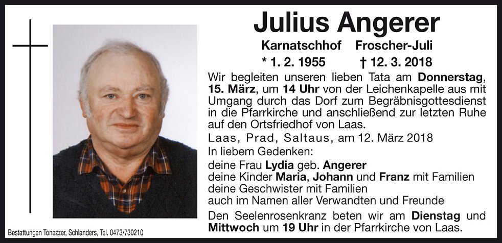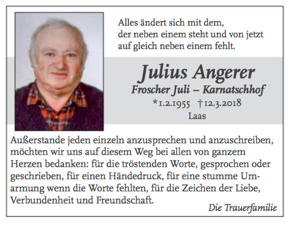 Wir begleiten unseren lieben Tata am Donnerstag, 15. März, um 14 Uhr von der Leichenkapelle aus mit Umgang durch das Dorf zum Begräbnisgottesdienst in die Pfarrkirche und anschließend zur letzten Ruhe auf den Ortsfriedhof von Laas.
