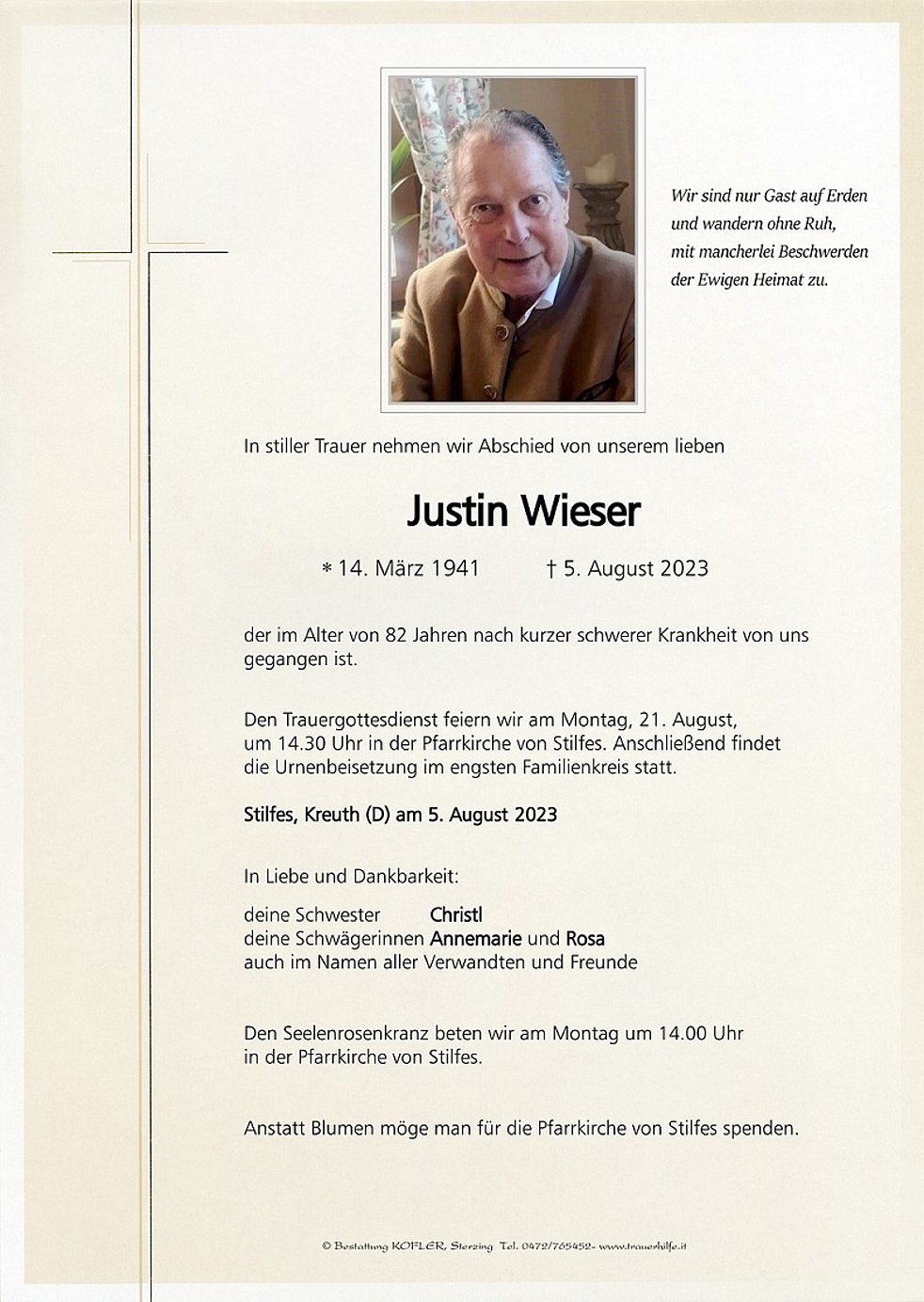 Den Trauergottesdienst feiern wir am Montag, 21. August, um 14.30 Uhr in der Pfarrkirche von Stilfes. Anschließend findet die Urnenbeisetzung im engsten Familienkreis statt.