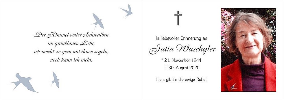 Die Abschiedsfeier für unsere liebe Jutta findet am Mittwoch, dem 2. September, um 14 Uhr in der Pfarrkirche von Dietenheim statt.