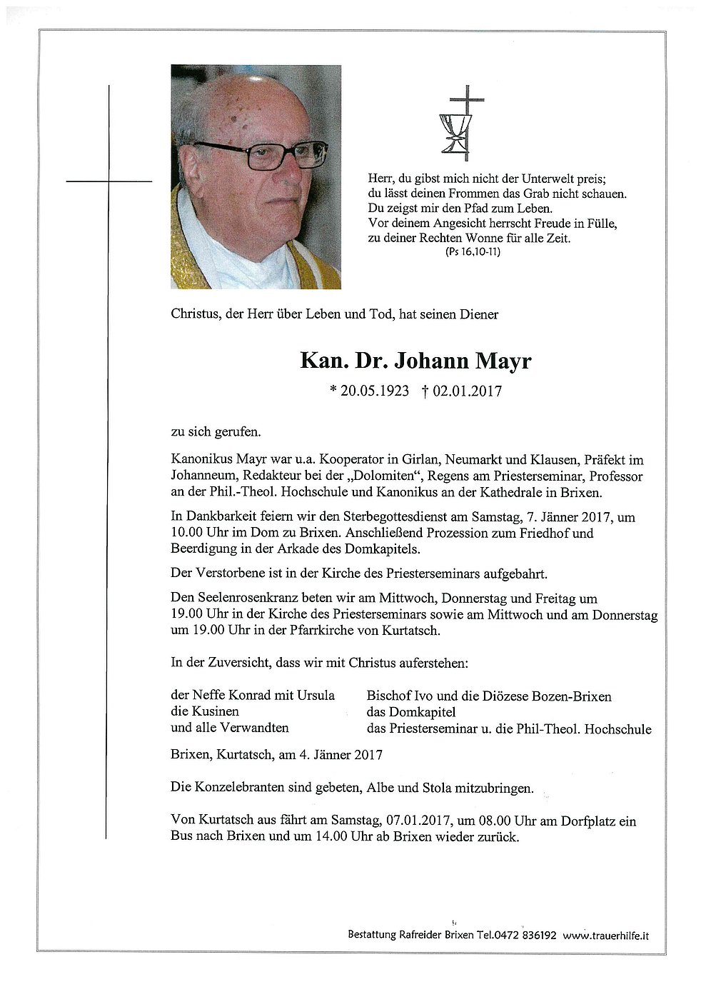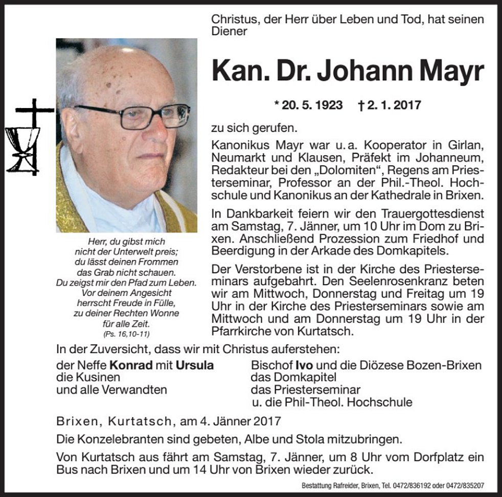 In Dankbarkeit feiern wir den Sterbegottesdienst am Samstag, 7. Jänner 2017, um 10.00 Uhr im Dom zu Brixen. Anschließend Prozession zum Friedhof und Beerdigung in der Arkade des Domkapitels.