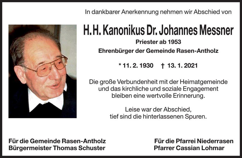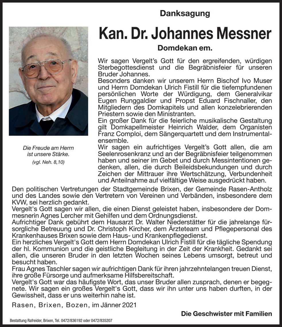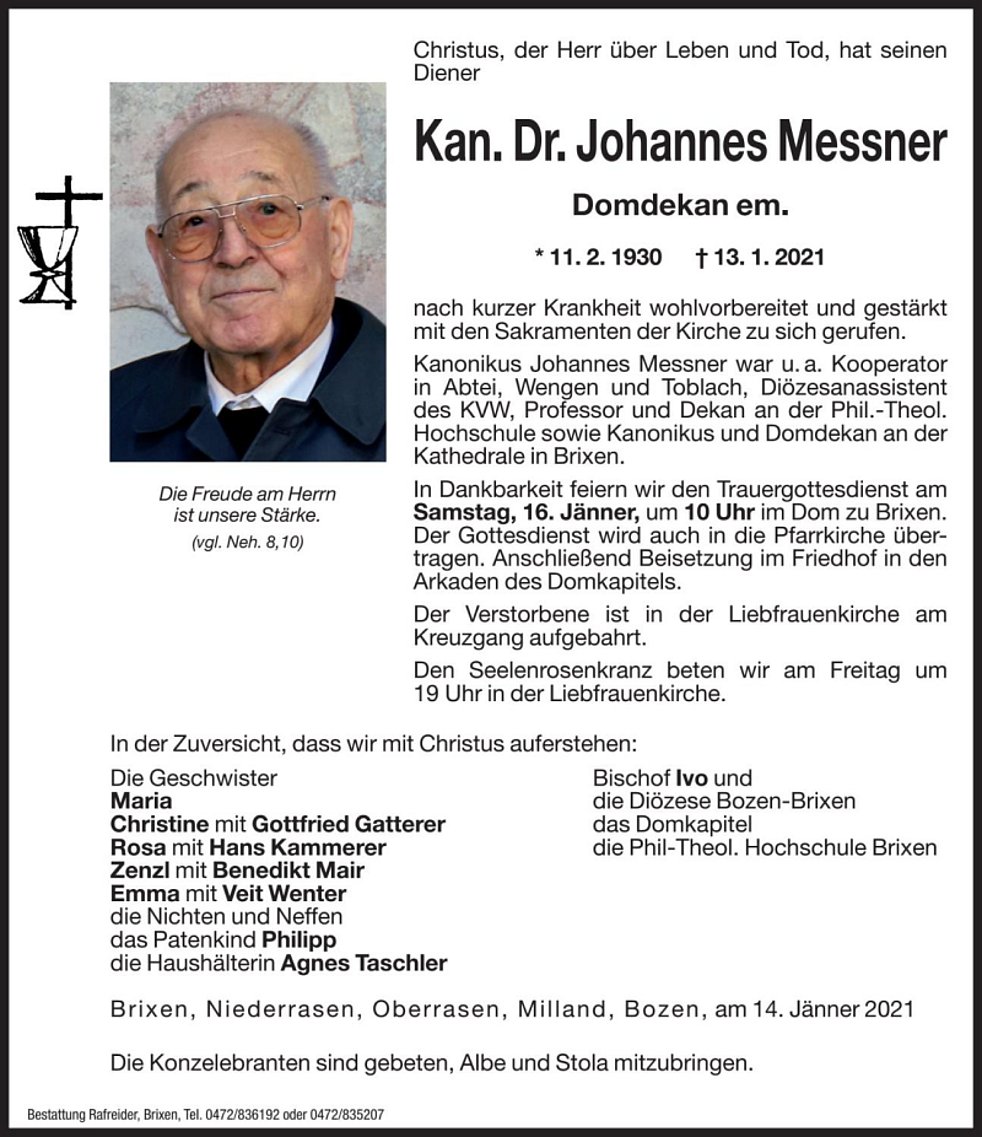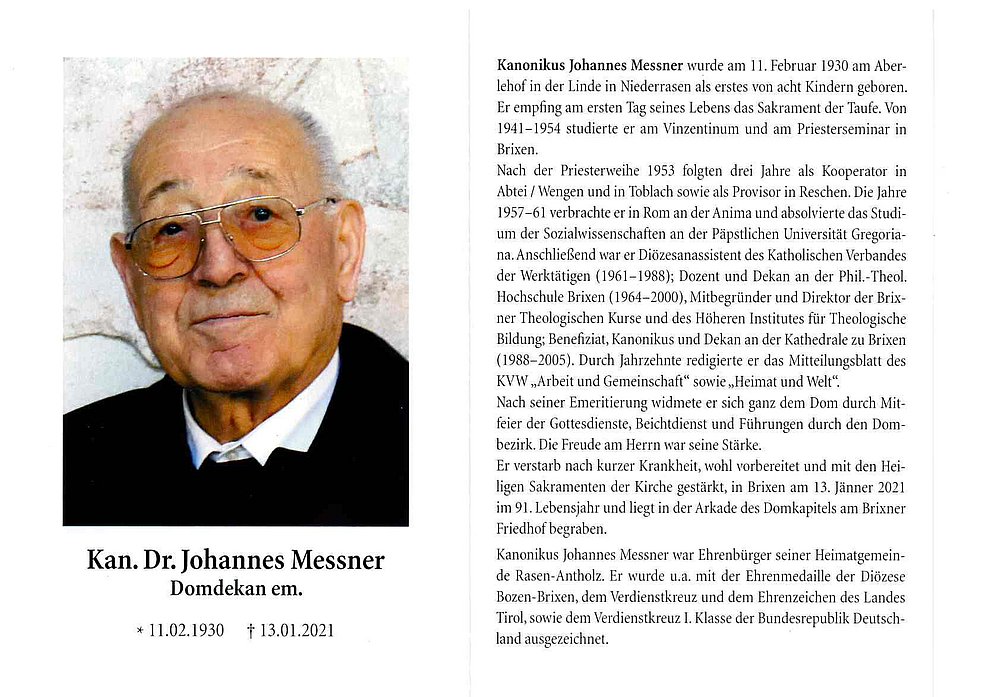 Kanonikus Johannes Messner war u.a. Kooperator in Abtei, Wengen und Toblach, Diözesanassistent des KVW, Professor und Dekan an der Phil.-Theol. Hochschule sowie Kanonikus und Domdekan an der Kathedrale in Brixen.
