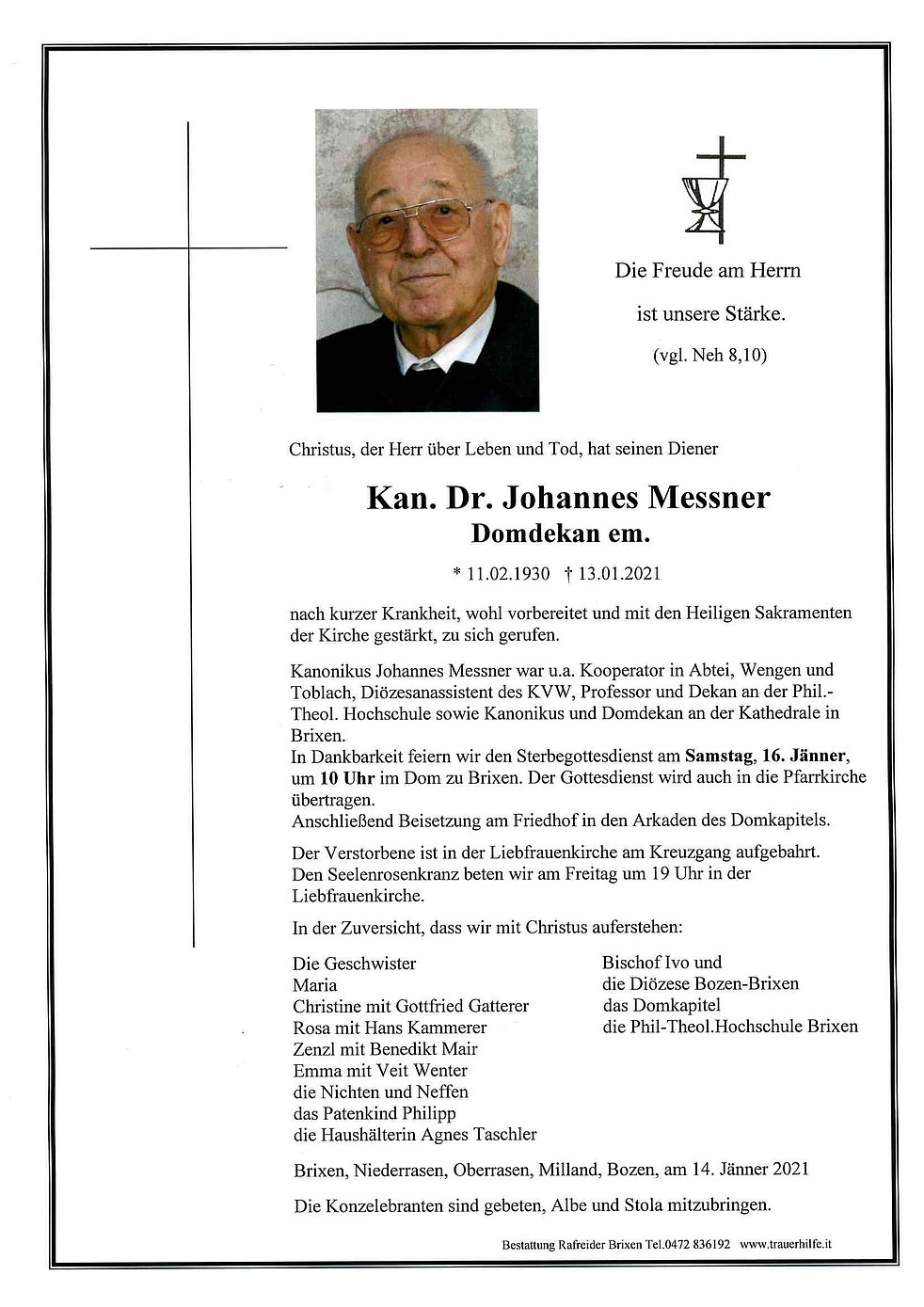 In Dankbarkeit feiern wir den Sterbegottesdienst am Samstag, 16. Jänner, um 10 Uhr im Dom zu Brixen. Der Gottesdienst wird auch in die Pfarrkirche übertragen.