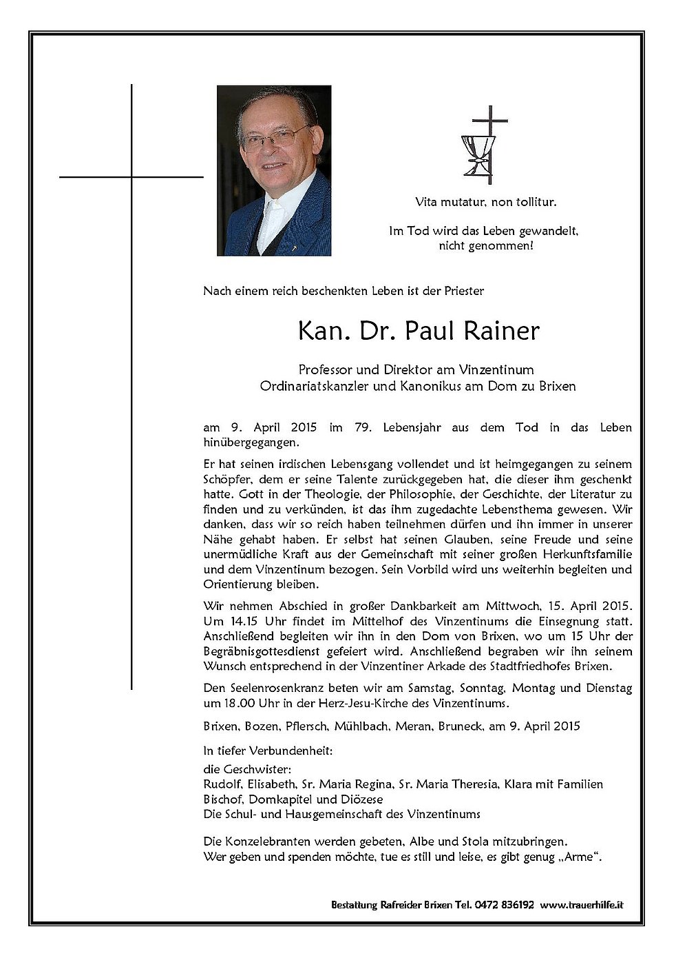 Wir nehmen Abschied in großer Dankbarkeit am Mittwoch, 15. April 2015. Um 14.15 Uhr findet im Mittelhof des Vinzentinums die Einsegnung statt. Anschließend begleiten wir ihn in den Dom von Brixen, wo um 15 Uhr der Begräbnisgottesdienst gefeiert wird. Anschließend begraben wir ihn seinem Wunsch entsprechend in der Vinzentiner Arkade des Stadtfriedhofes Brixen.