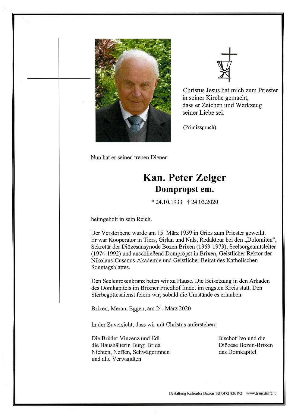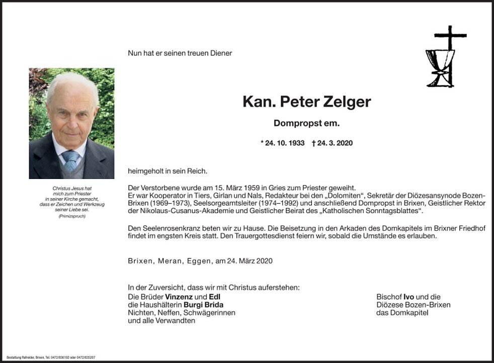 Den Seelenrosenkranz beten wir zu Hause. Die Beisetzung in den Arkaden des Domkapitels im Brixner Friedhof findet im engsten Kreis statt. Den Sterbegottesdienst feiern wir, sobald die Umstände es erlauben.