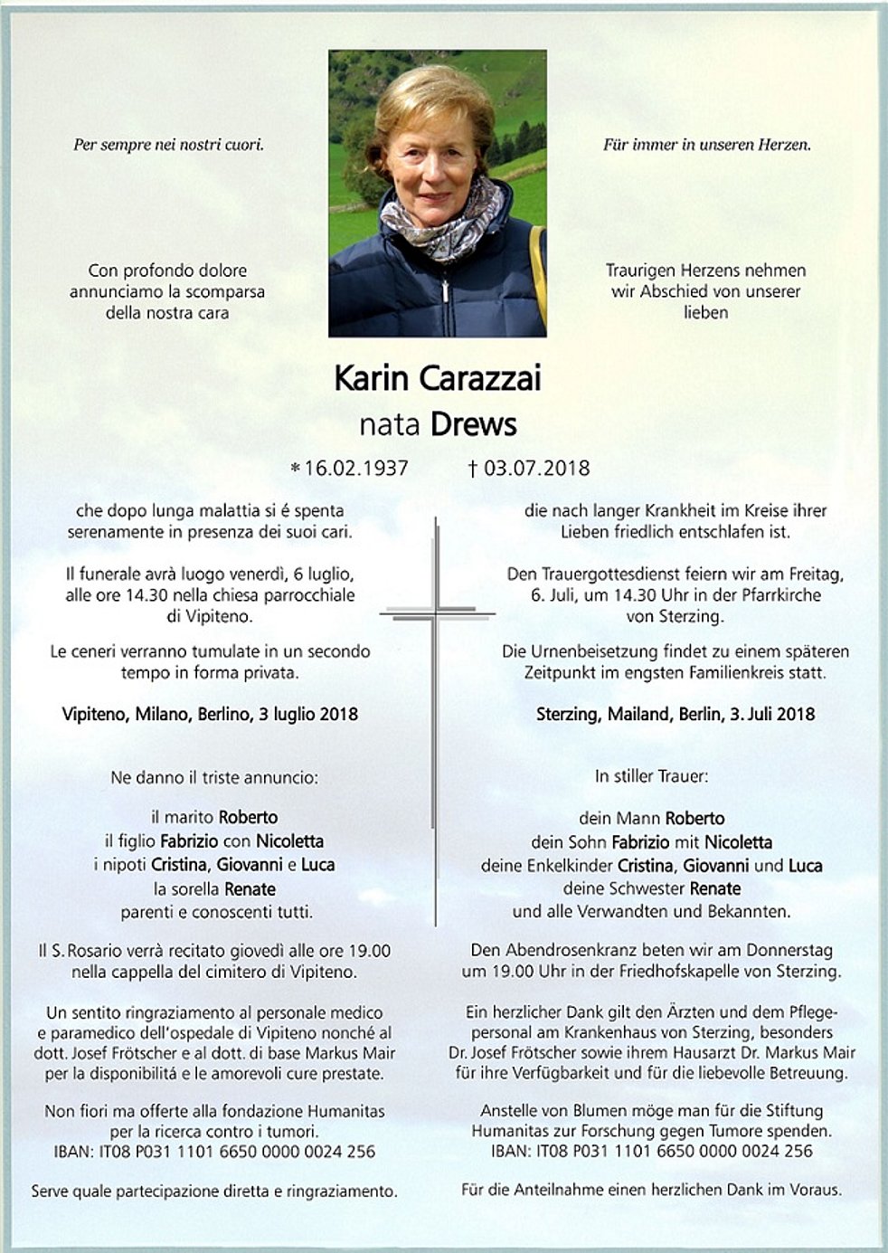 Anstelle von Blumen möge man für die Stiftung Humanitas zur Forschung gegen Tumore spenden. IBAN: IT08 P031 1101 6650 0000 0024 256
