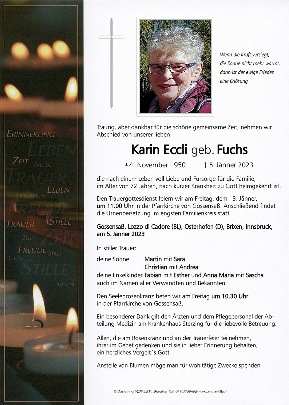 Den Trauergottesdienst feiern wir am Freitag, dem 13. Jänner, um 11.00 Uhr in der Pfarrkirche von Gossensaß. Anschließend findet die Urnenbeisetzung im engsten Familienkreis statt.