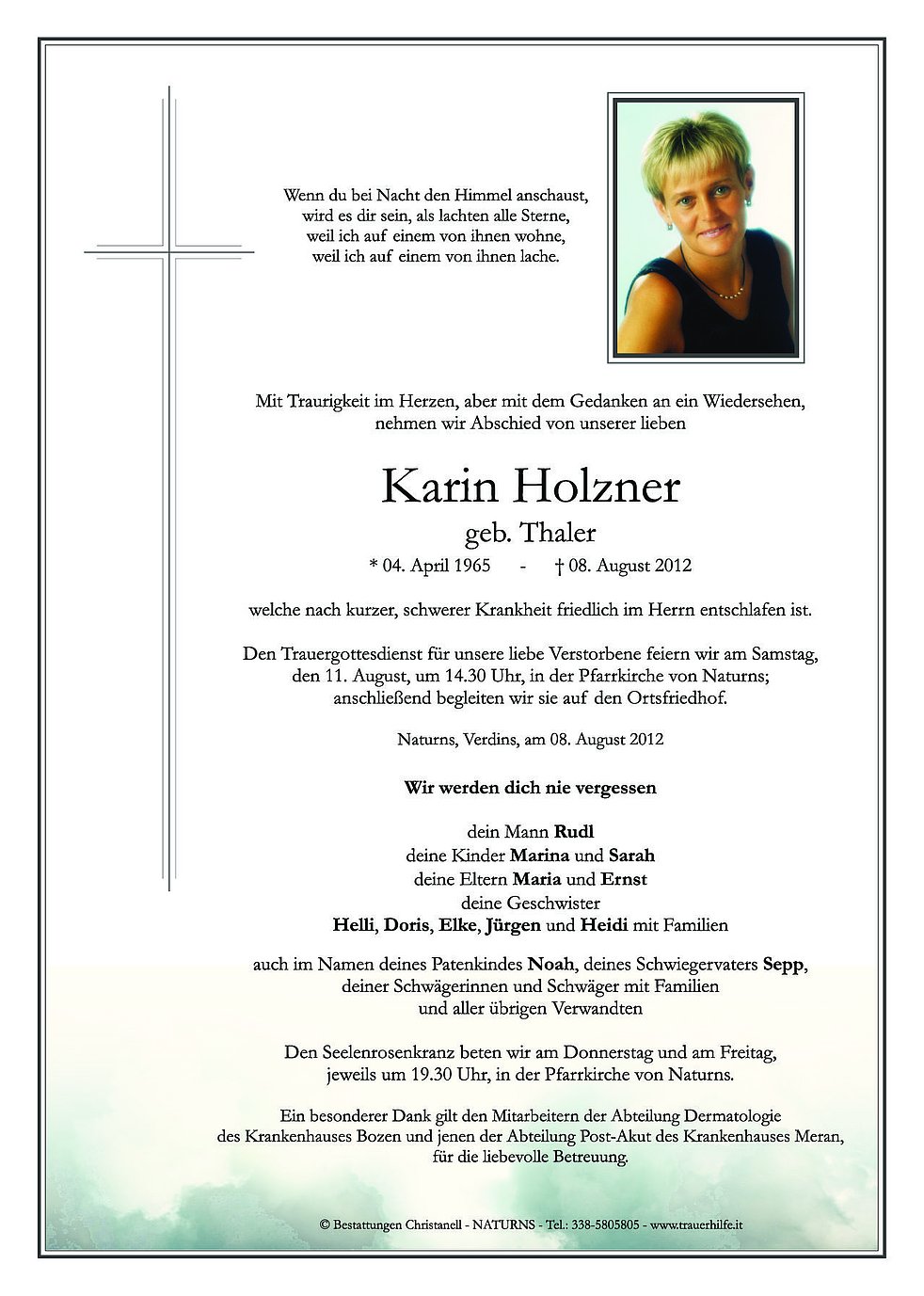 Den Trauergottesdienst für unsere liebe Verstorbene feiern wir am Samstag, den 11. August, um 14.30 Uhr, in der Pfarrkirche von Naturns; anschließend begleiten wir sie auf den Ortsfriedhof.