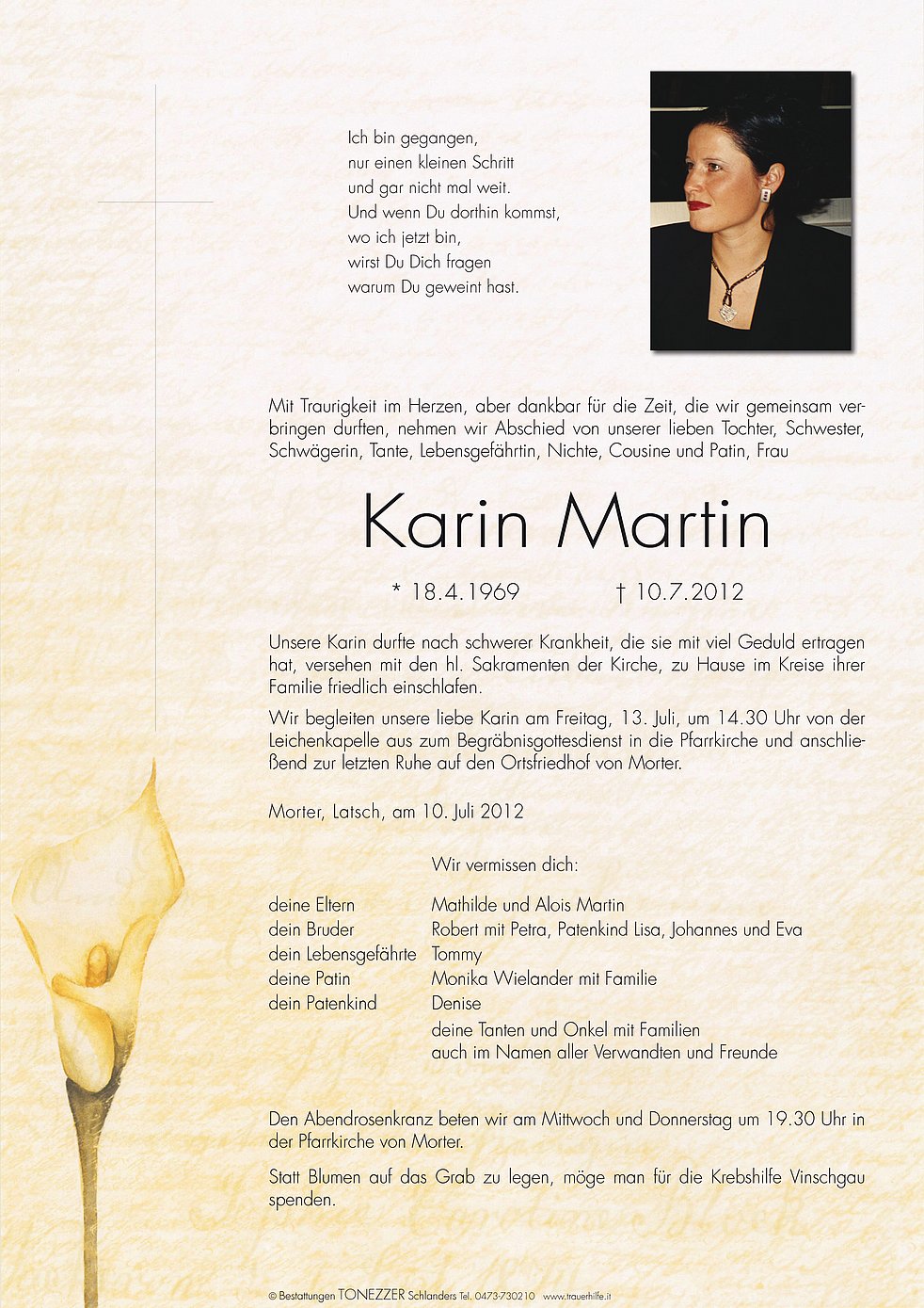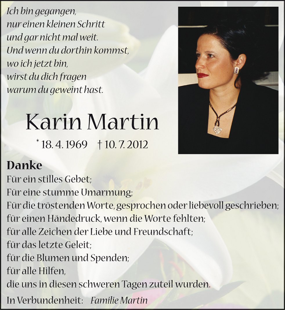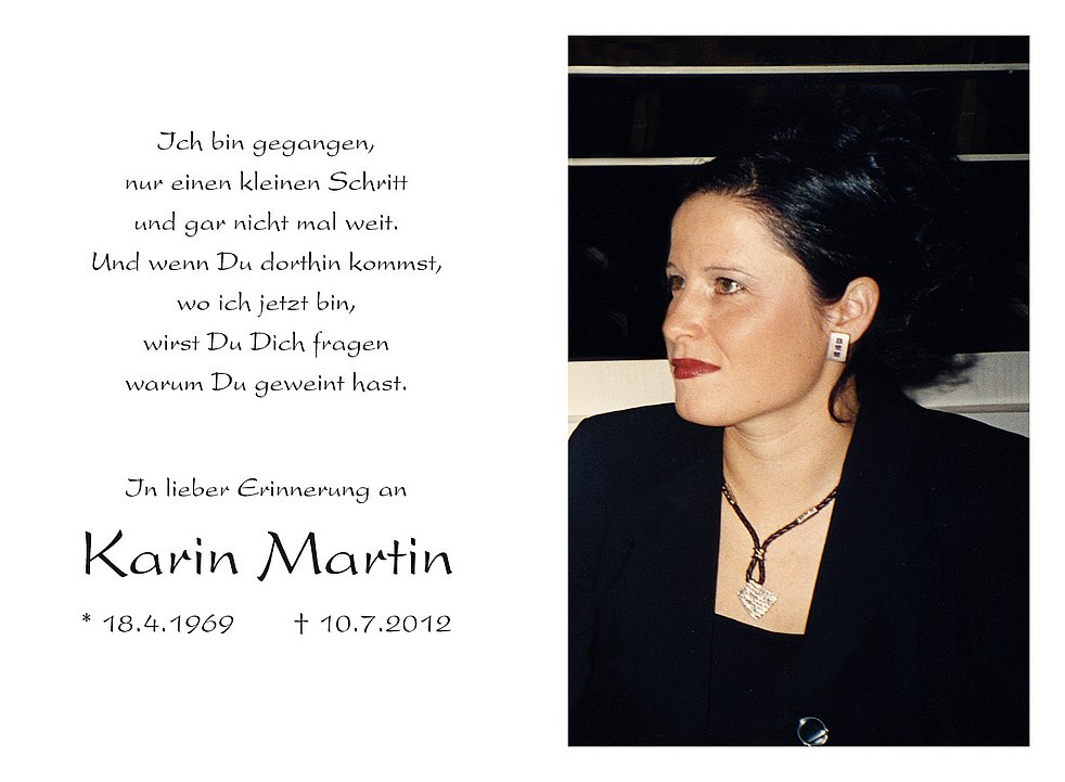 Unsere Karin durfte nach schwerer Krankheit, die sie mit viel Geduld ertragen hat, versehen mit den hl. Sakramenten der Kirche, zu Hause im Kreise ihrer Familie friedlich einschlafen.