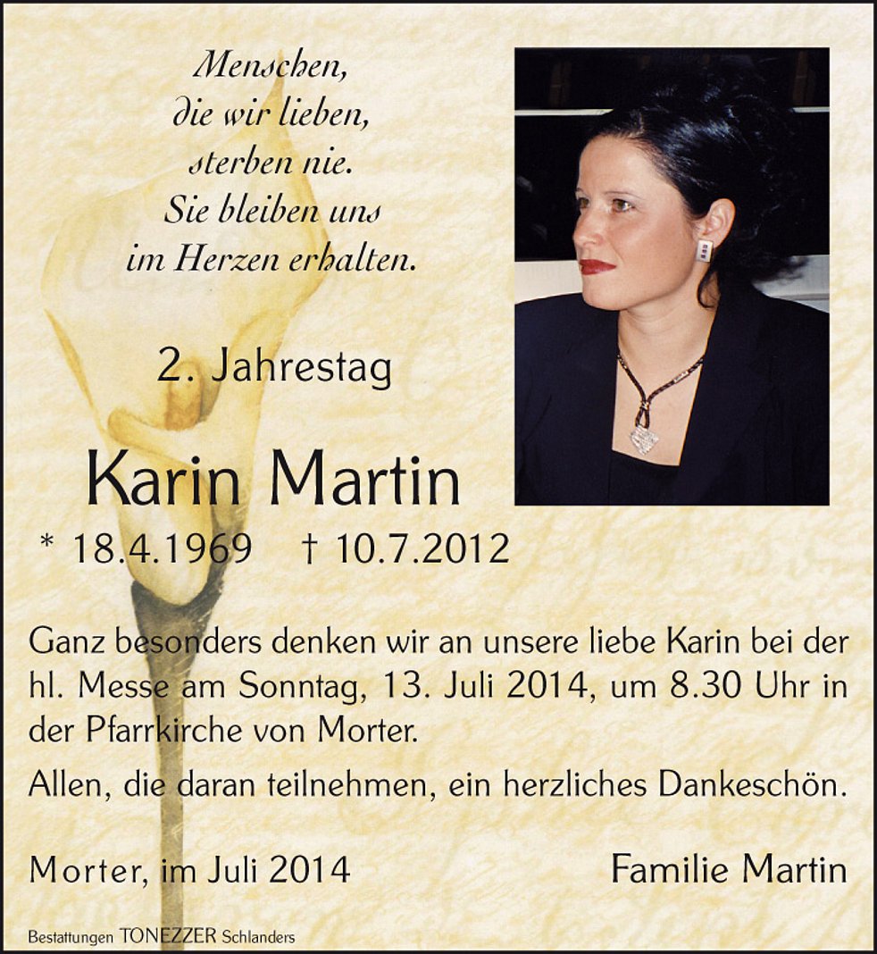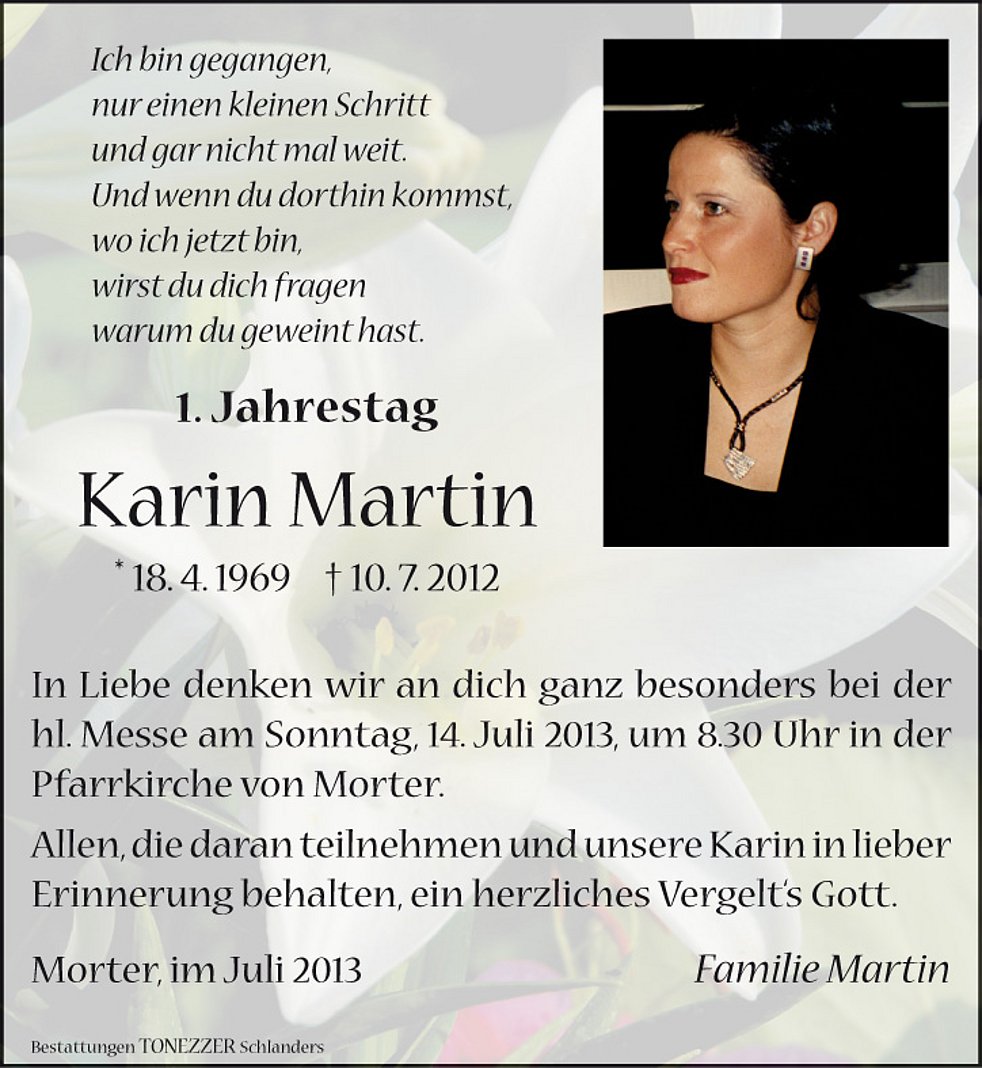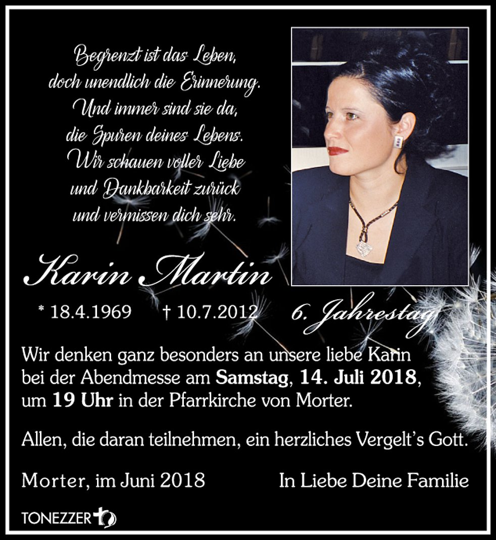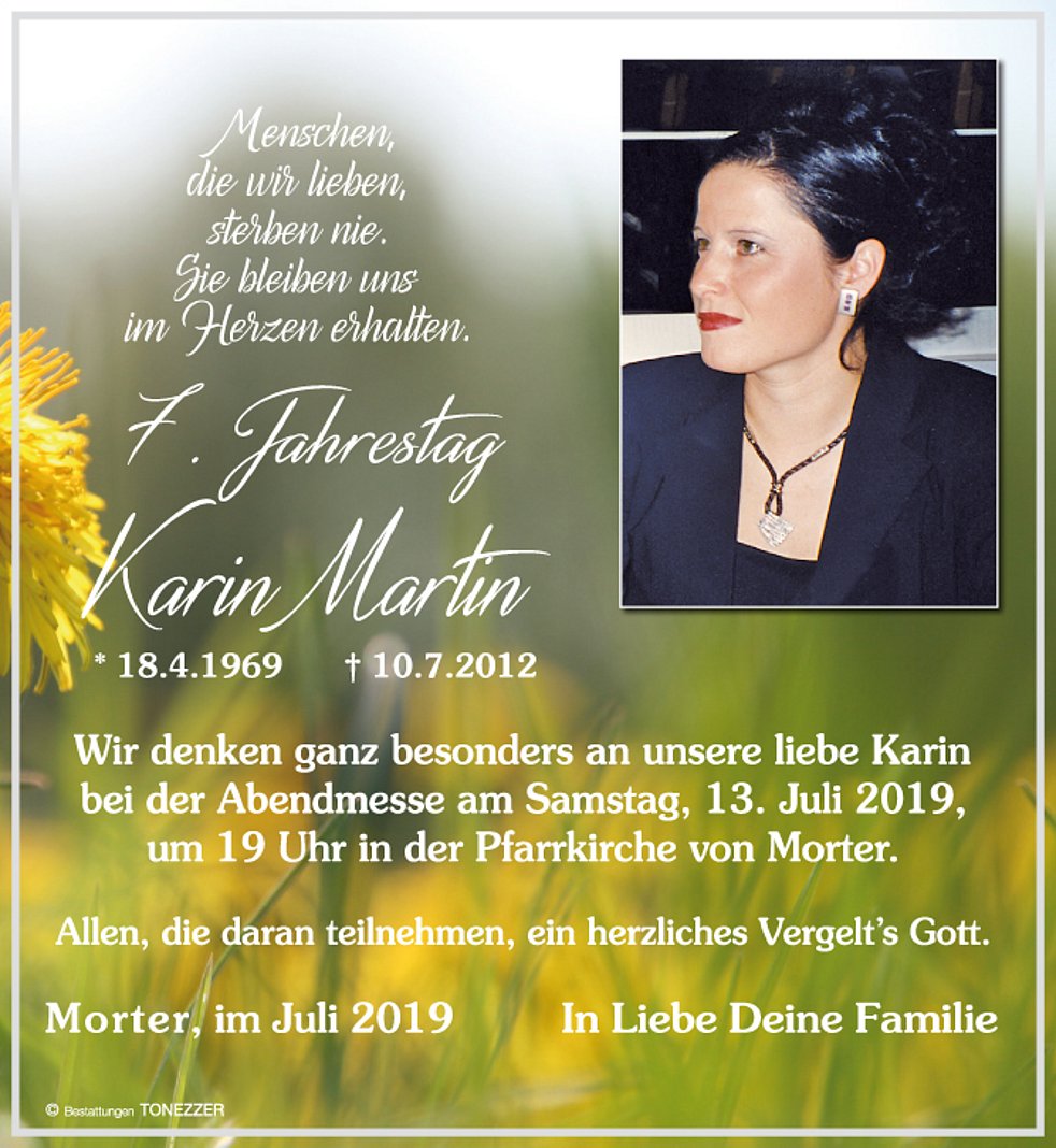 Wir begleiten unsere liebe Karin am Freitag, 13. Juli, um 14.30 Uhr von der Leichenkapelle aus zum Begräbnisgottesdienst in die Pfarrkirche und anschließend zur letzten Ruhe auf den Ortsfriedhof von Morter.