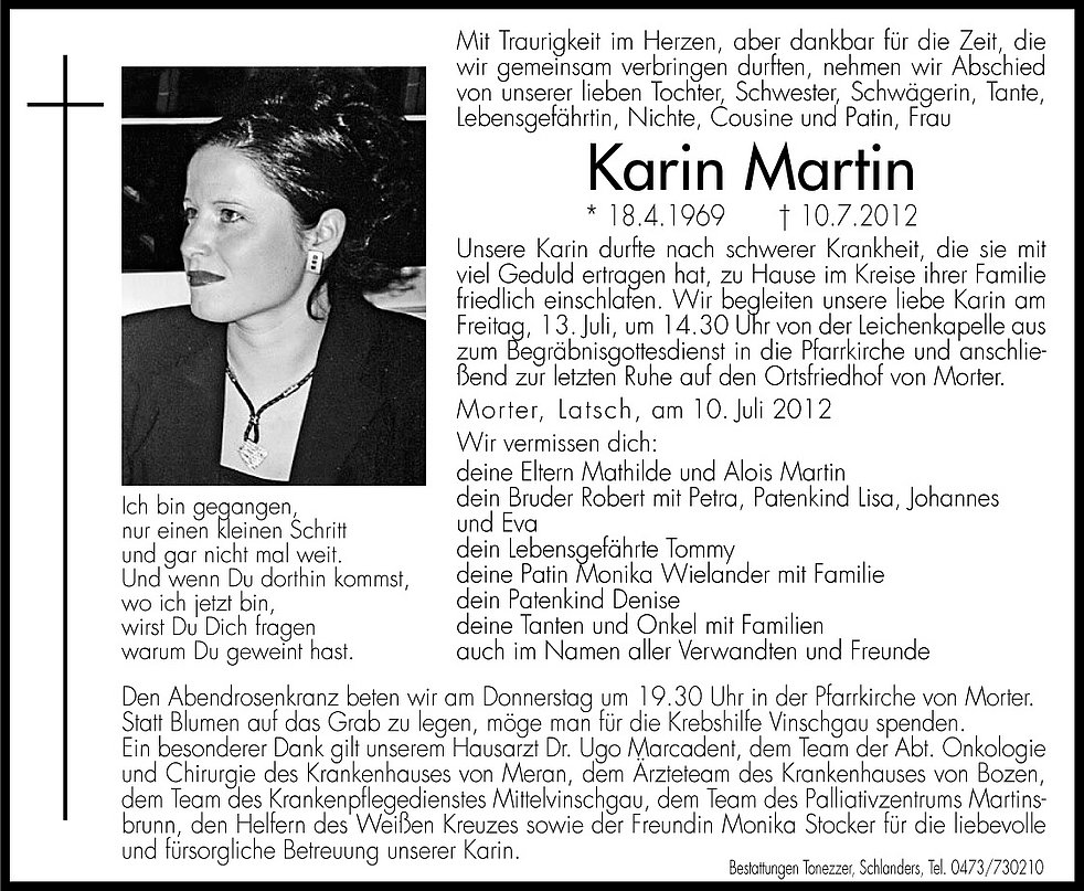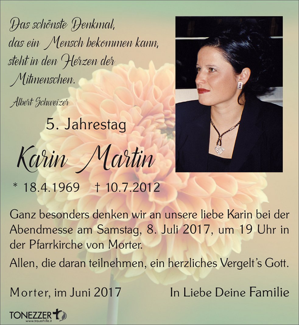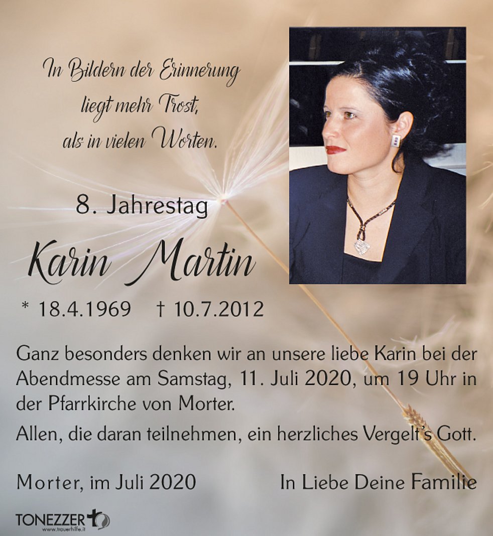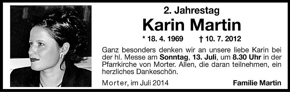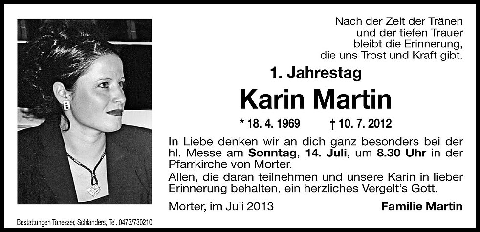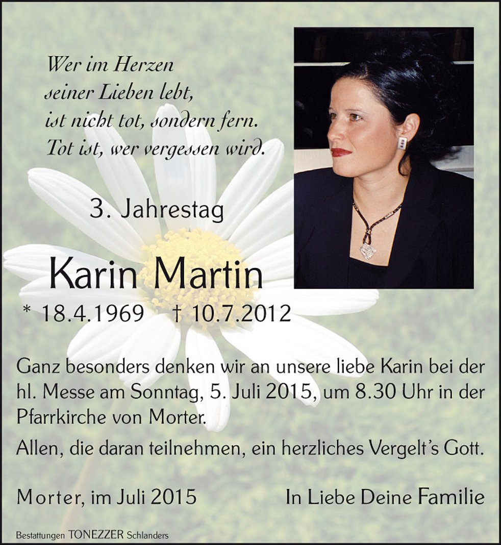 Wir begleiten unsere liebe Karin am Freitag, 13. Juli, um 14.30 Uhr von der Leichenkapelle aus zum Begräbnisgottesdienst in die Pfarrkirche und anschließend zur letzten Ruhe auf den Ortsfriedhof von Morter.