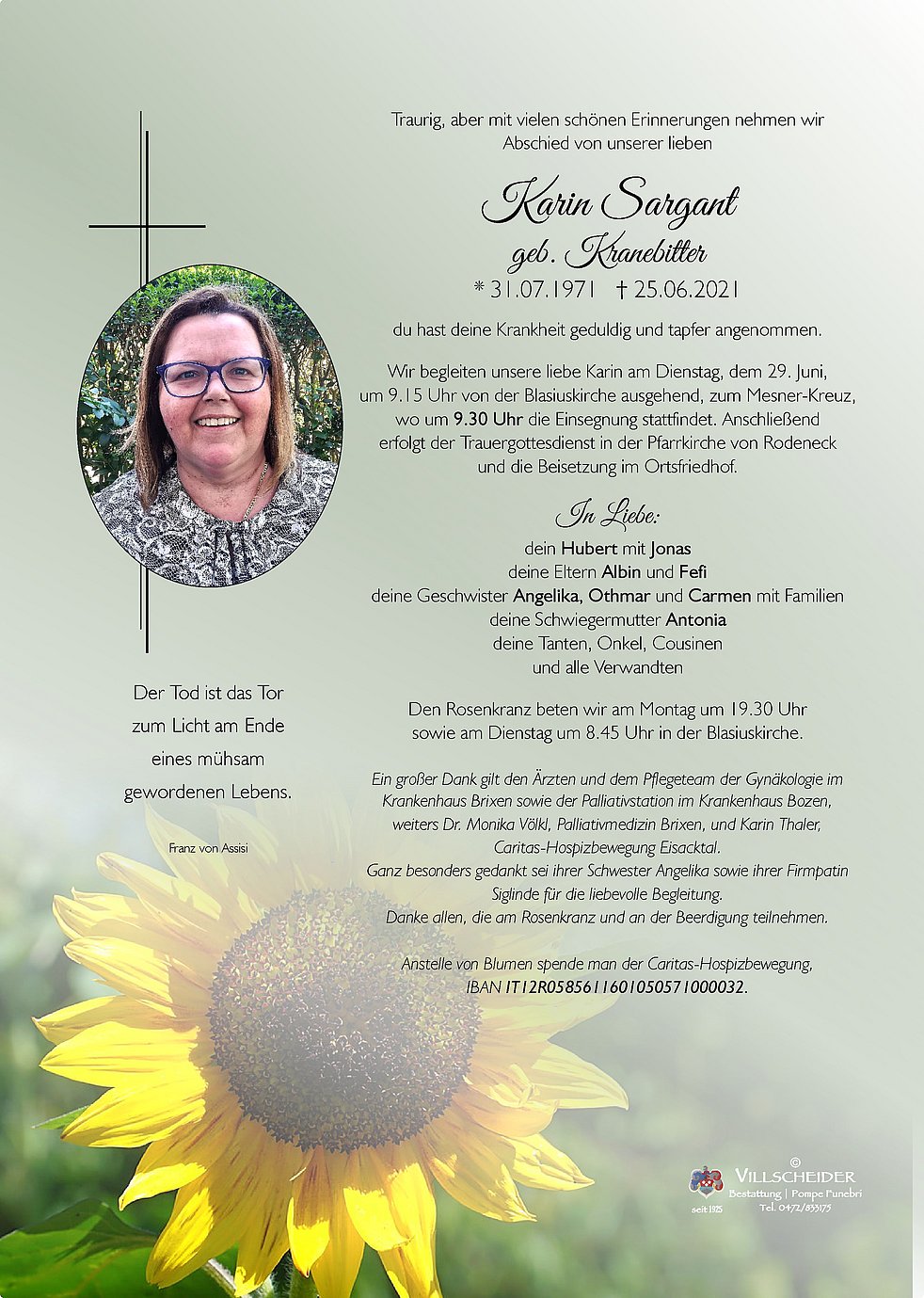 Ach liebe Karin du worsch olm so freundlich wenn mir inz im Kronknhaus begegnet sein und du hoschsogor meinen Nomen olm gwisst liebe Karin sei nun geborgen in Gottes Hand