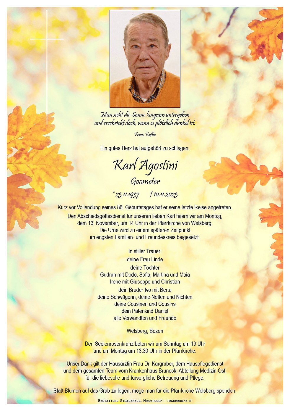 Wir möchten Euch liebe Trauerfamilie unsere aufrichtiges Mitgefühl ausdrücken! Wir werden Herrn Augustini in guter und lieber Errinnerungen behalten...nun lassen wir Ihn Ruhen in Frieden🙏🙏