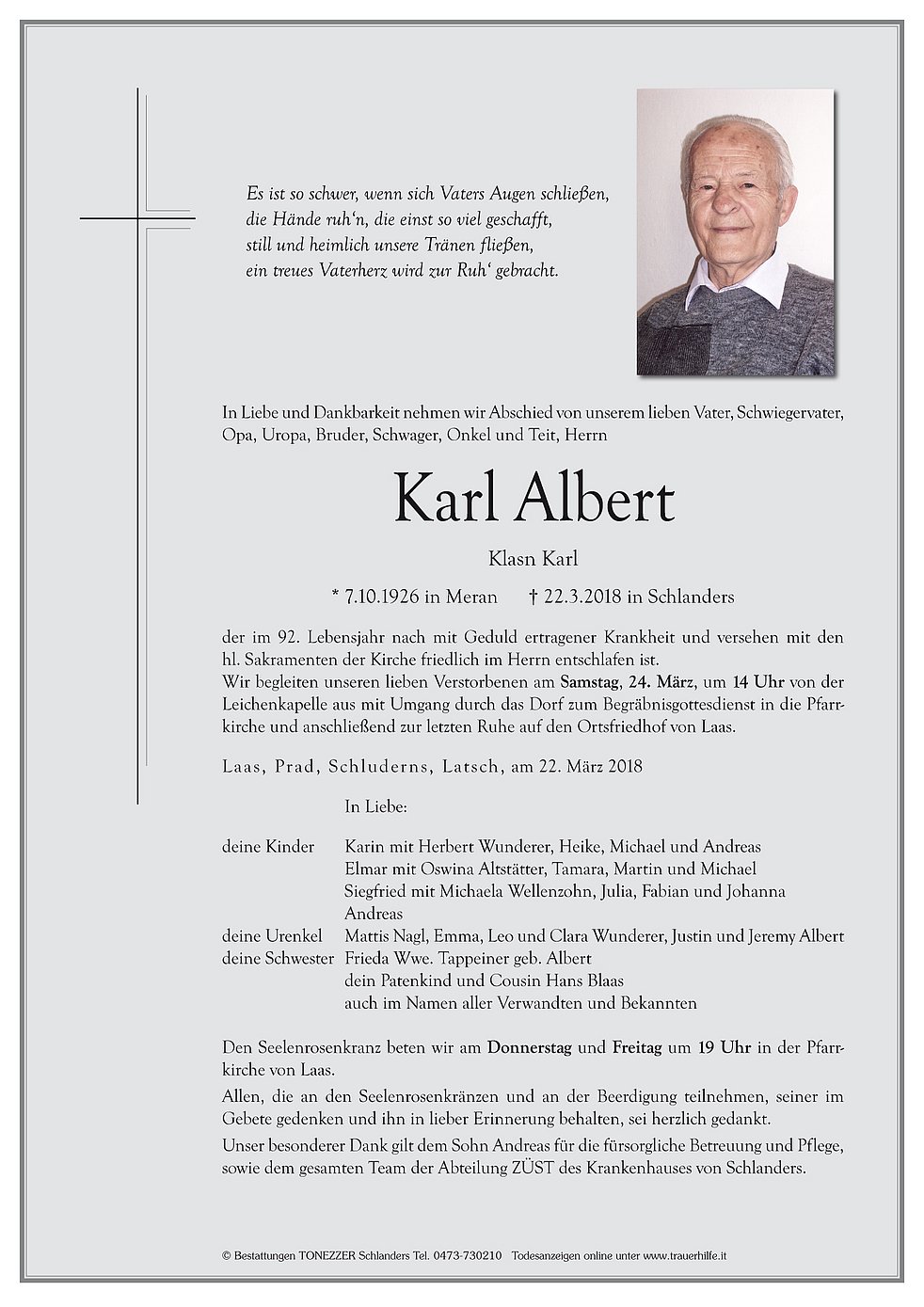 Wir begleiten unseren lieben Verstorbenen am Samstag, 24. März, um 14 Uhr von der Leichenkapelle aus mit Umgang durch das Dorf zum Begräbnisgottesdienst in die Pfarrkirche und anschließend zur letzten Ruhe auf den Ortsfriedhof von Laas.