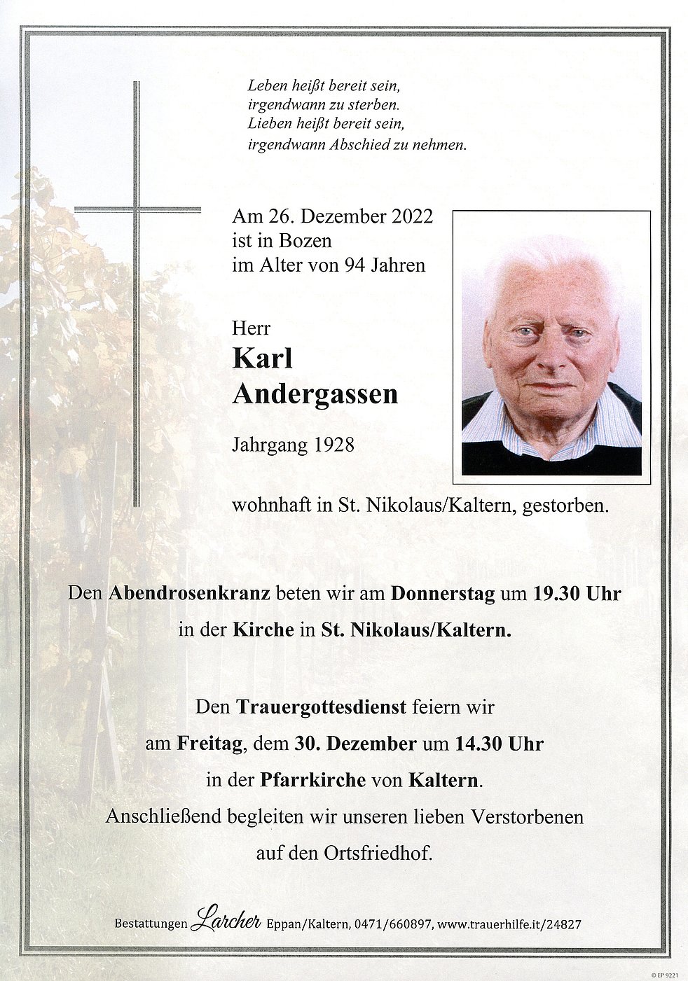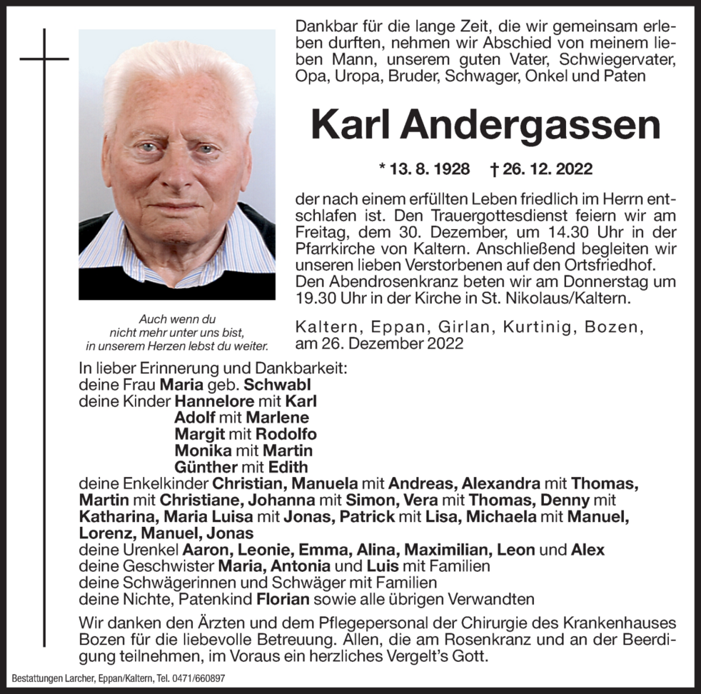 Den Trauergottesdienst feiern wir am Freitag, dem 30. Dezember um 14.30 Uhr in der Pfarrkirche von Kaltern. Anschließend begleiten wir unseren lieben Verstorbenen auf den Ortsfriedhof.