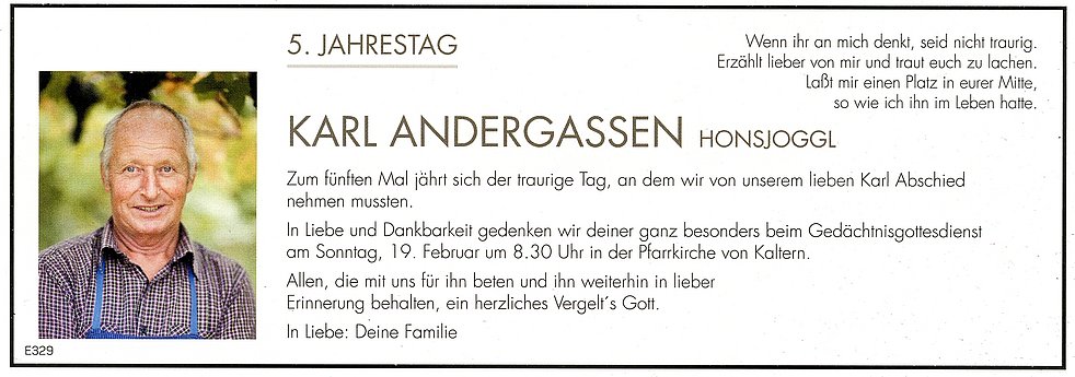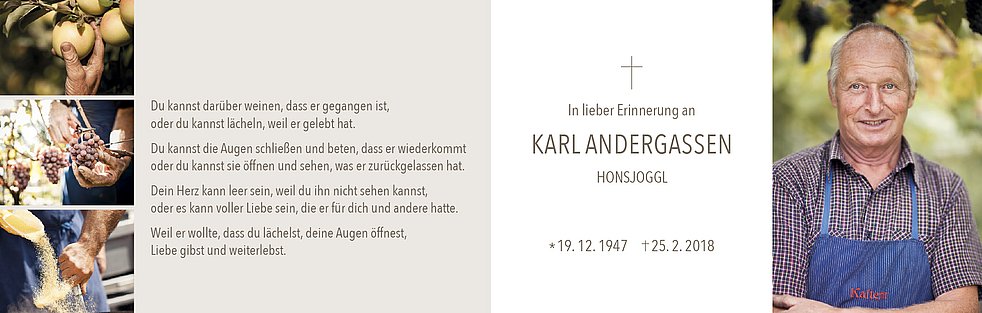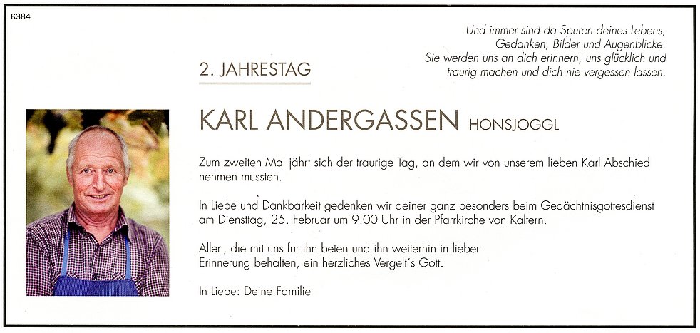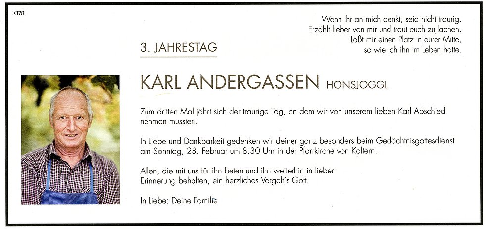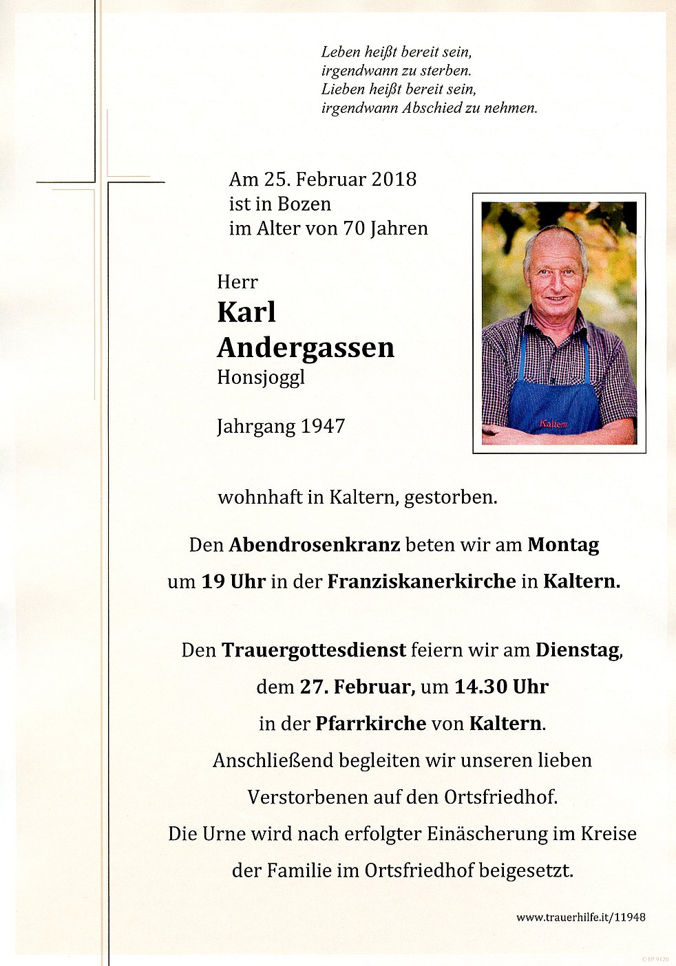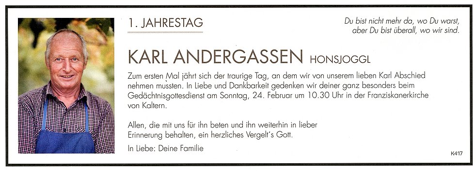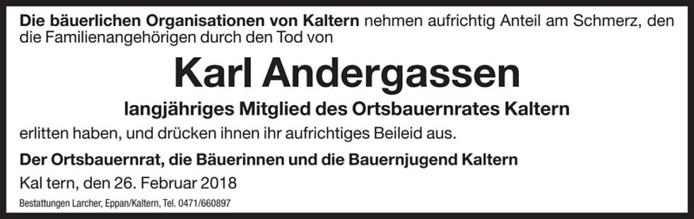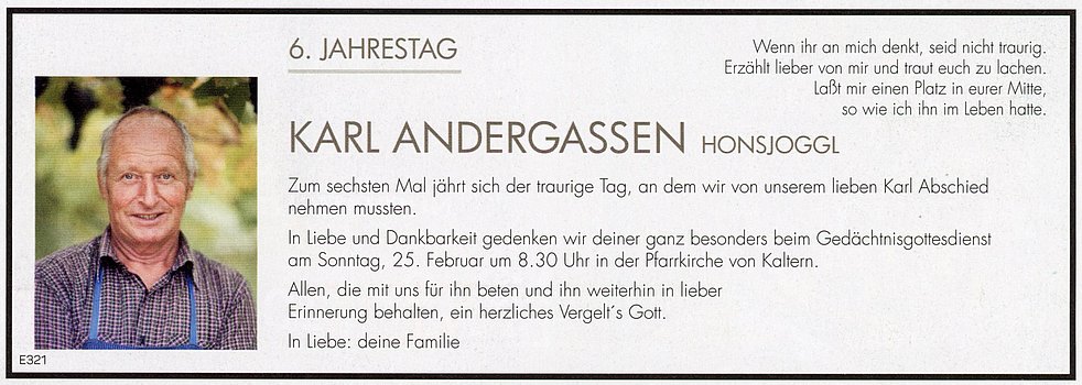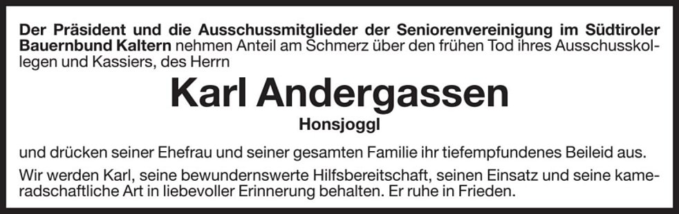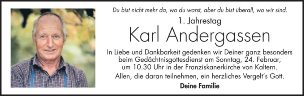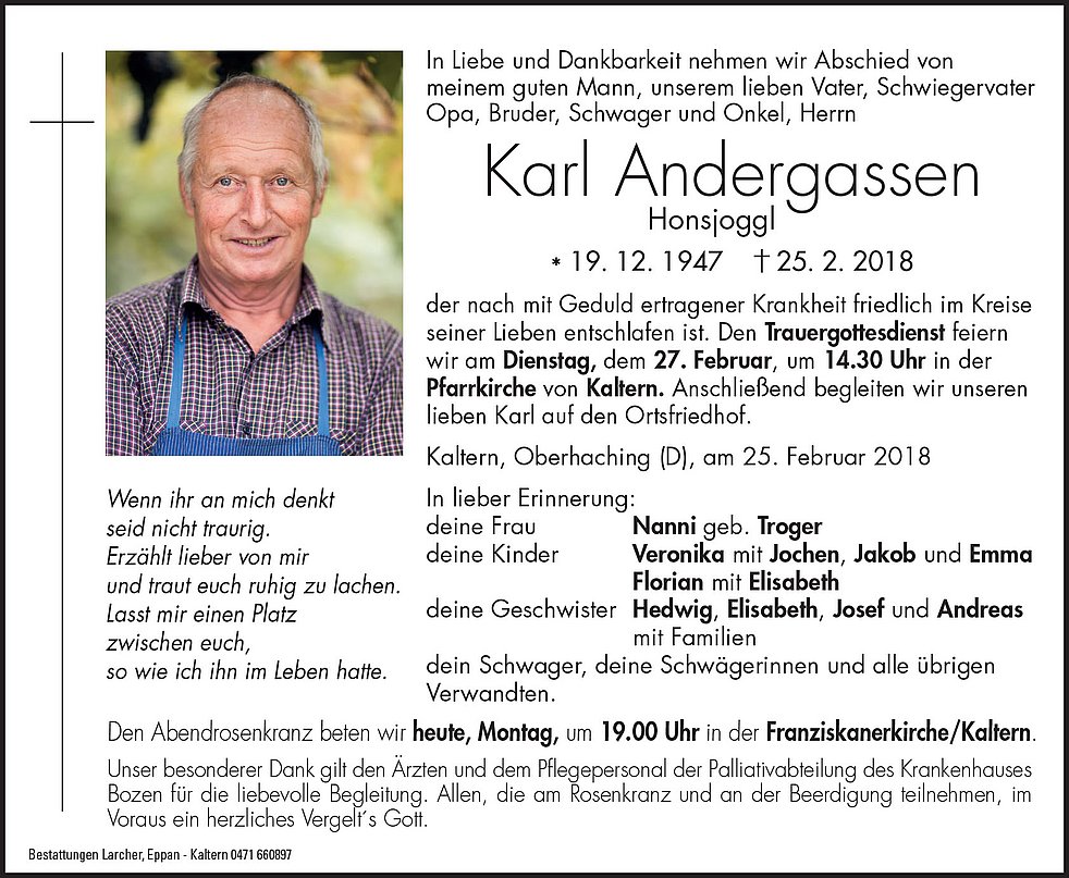 Den Trauergottesdienst feiern wir am Dienstag, dem 27. Februar, um 14.30 Uhr in der Pfarrkirche von Kaltern. Anschließend begleiten wir unseren lieben Karl auf den Ortsfriedhof.
