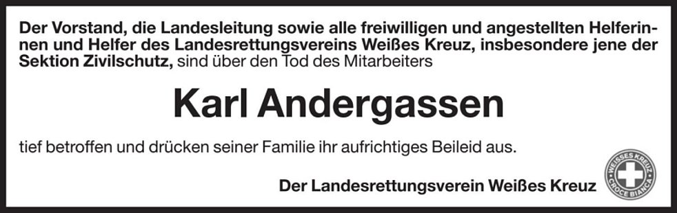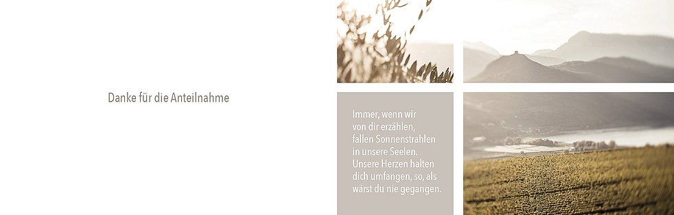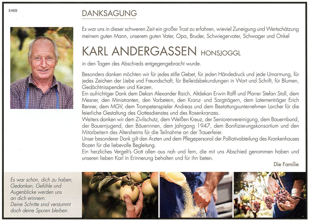 Unser besonderer Dank gilt den Ärzten und dem Pflegepersonal der Palliativabteilung des Krankenhauses Bozen für die liebevolle Begleitung. Allen, die am Rosenkranz und an der Beerdigung teilnehmen, im Voraus ein herzliches Vergelt´s Gott.