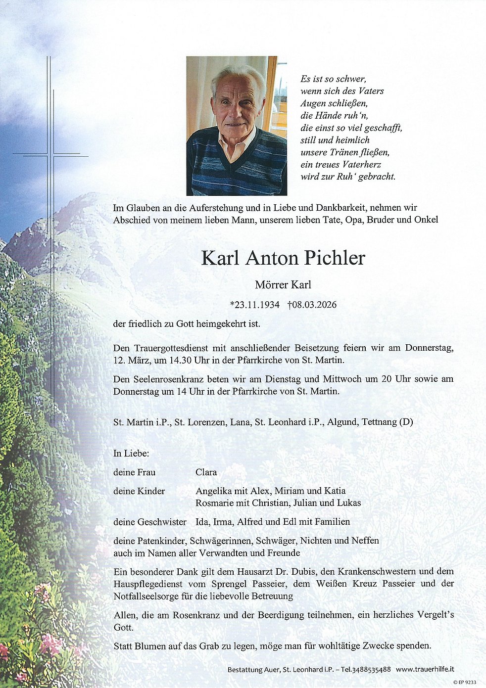 Ein besonderer Dank gilt dem Hausarzt Dr. Dubis, den Krankenschwestern und dem Hauspflegedienst vom Sprengel Passeier, dem Weißen Kreuz Passeier und der Notfallseelsorge für die liebevolle Betreuung