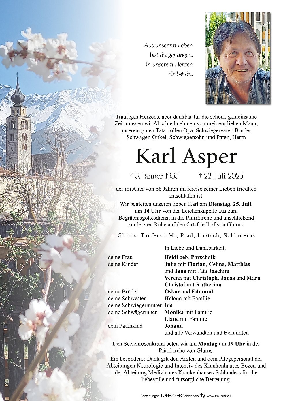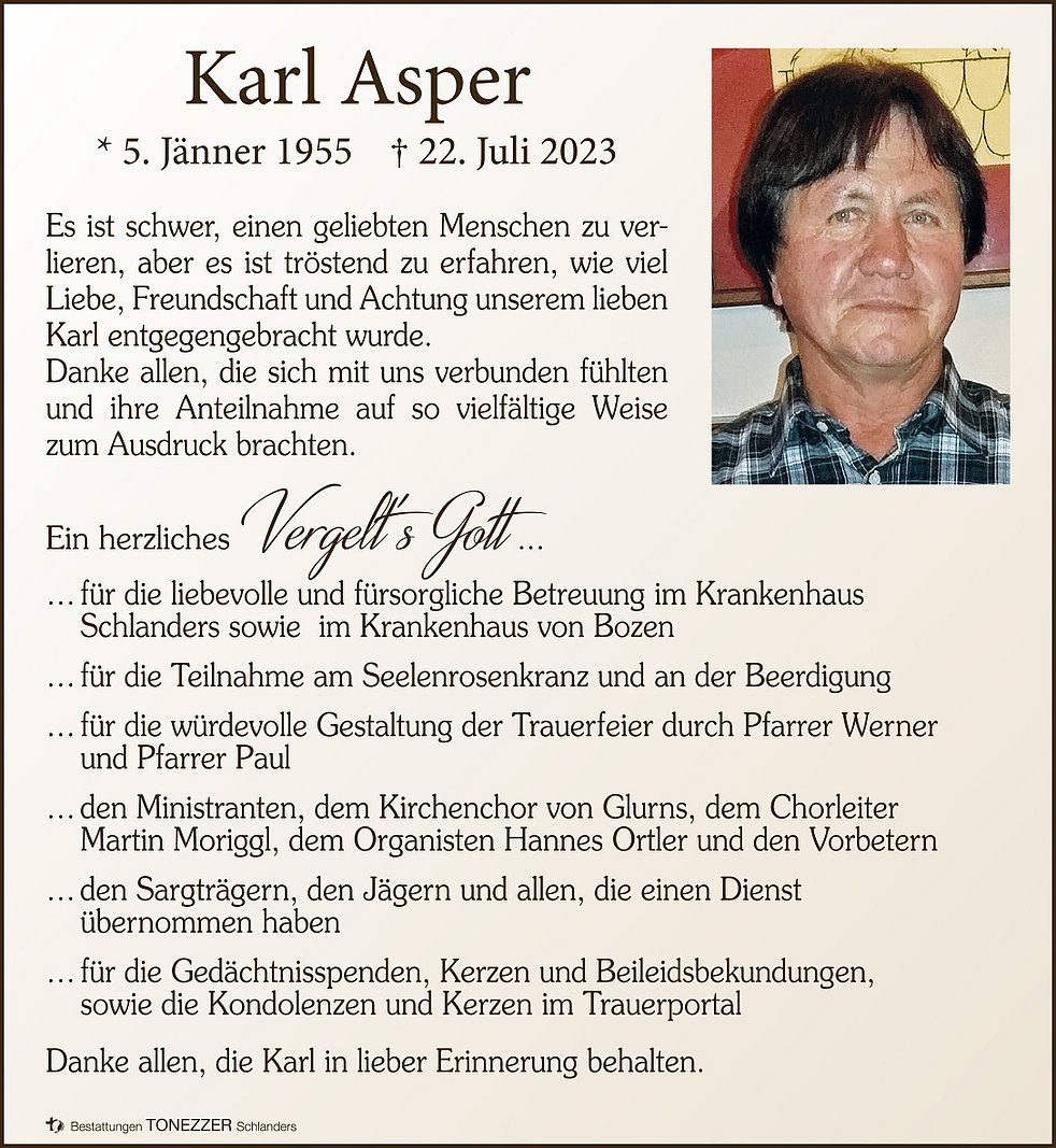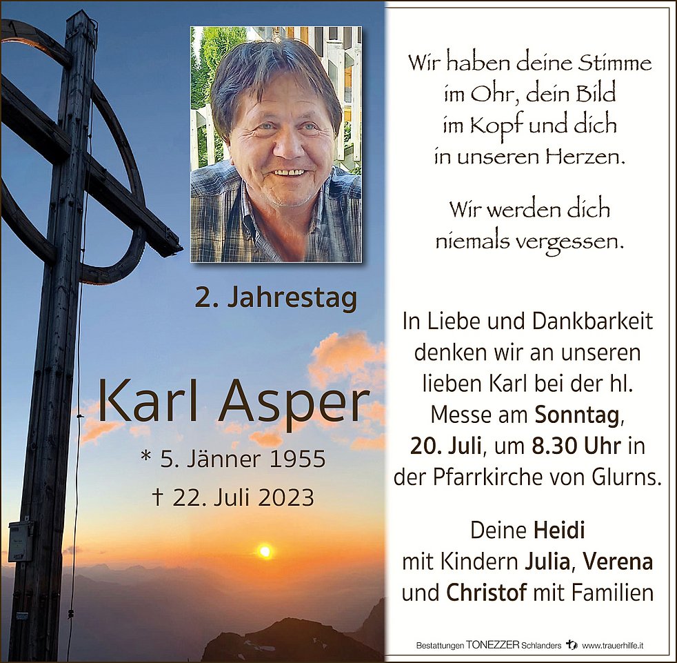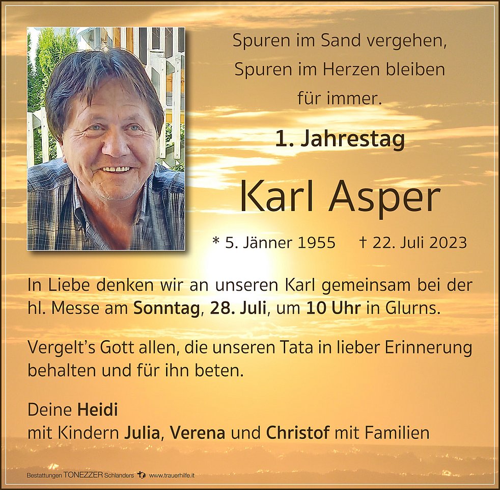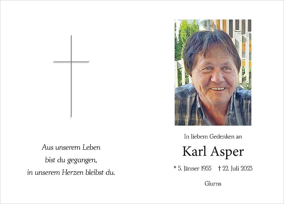 Wir begleiten unseren lieben Karl am Dienstag, 25. Juli, um 14 Uhr von der Leichenkapelle aus zum Begräbnisgottesdienst in die Pfarrkirche und anschließend zur letzten Ruhe auf den Ortsfriedhof von Glurns.