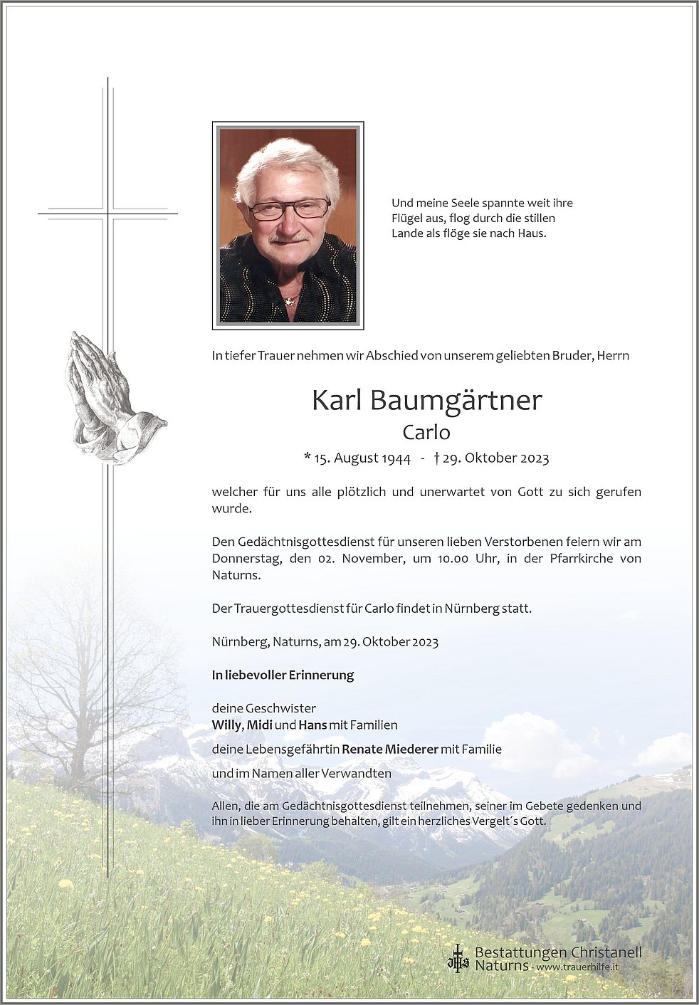 Den Gedächtnisgottesdienst für unseren lieben Verstorbenen feiern wir am Donnerstag, den 02. November, um 10.00 Uhr, in der Pfarrkirche von Naturns.