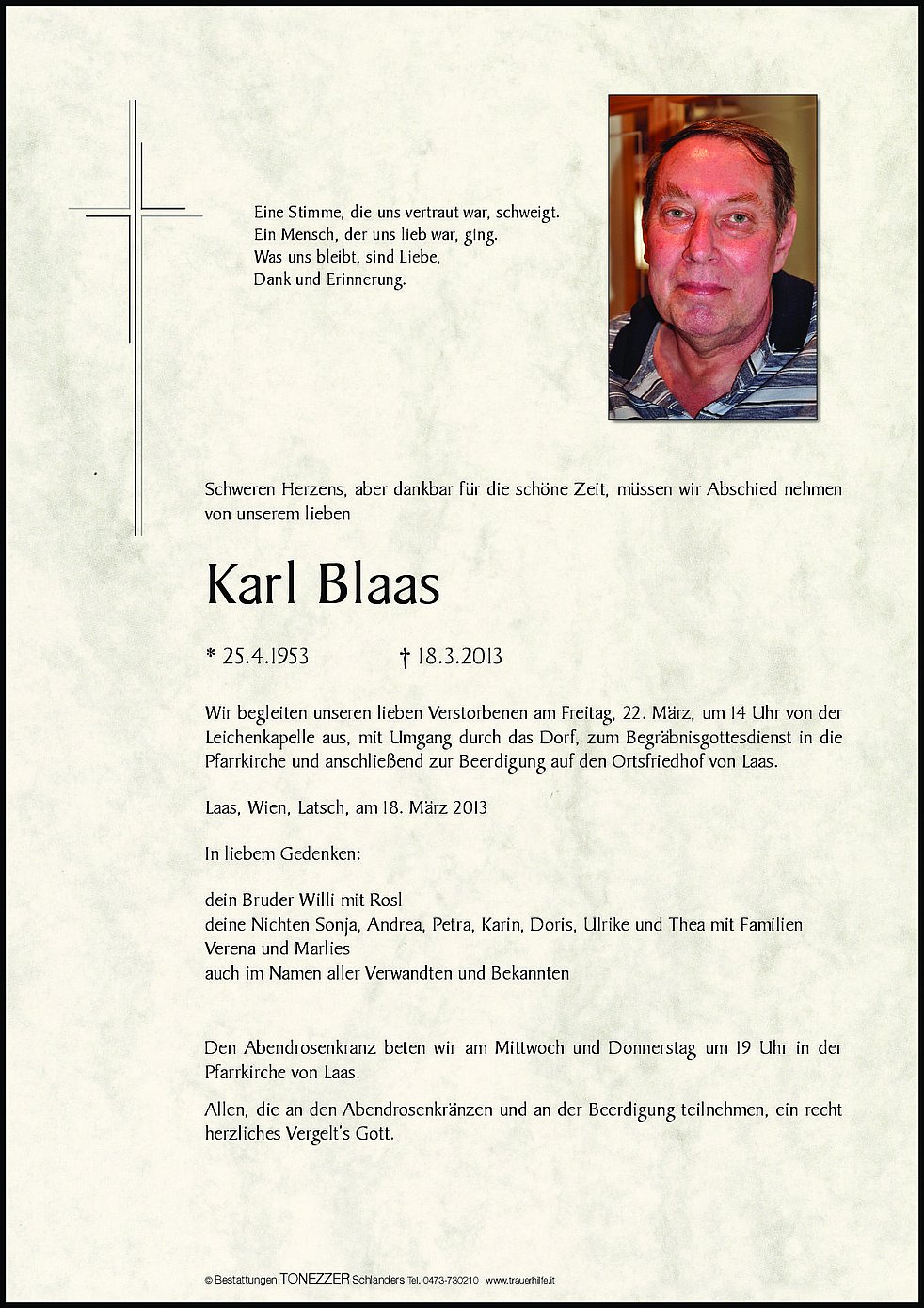 Wir begleiten unseren lieben Verstorbenen am Freitag, 22. März, um 14 Uhr von der Leichenkapelle aus, mit Umgang durch das Dorf, zum Begräbnisgottesdienst in die Pfarrkirche und anschließend zur Beerdigung auf den Ortsfriedhof von Laas.