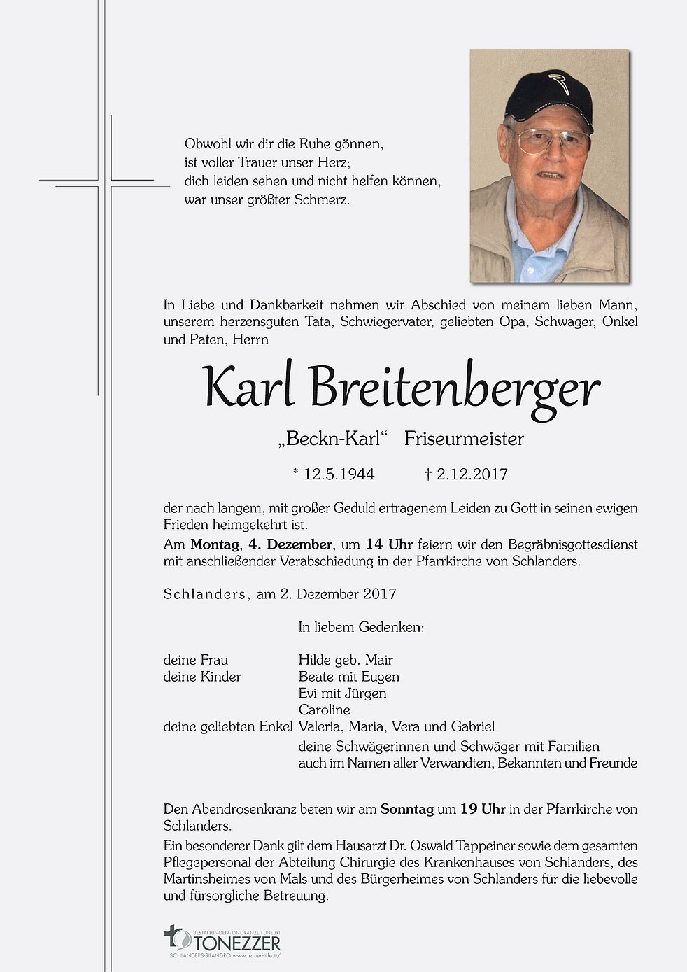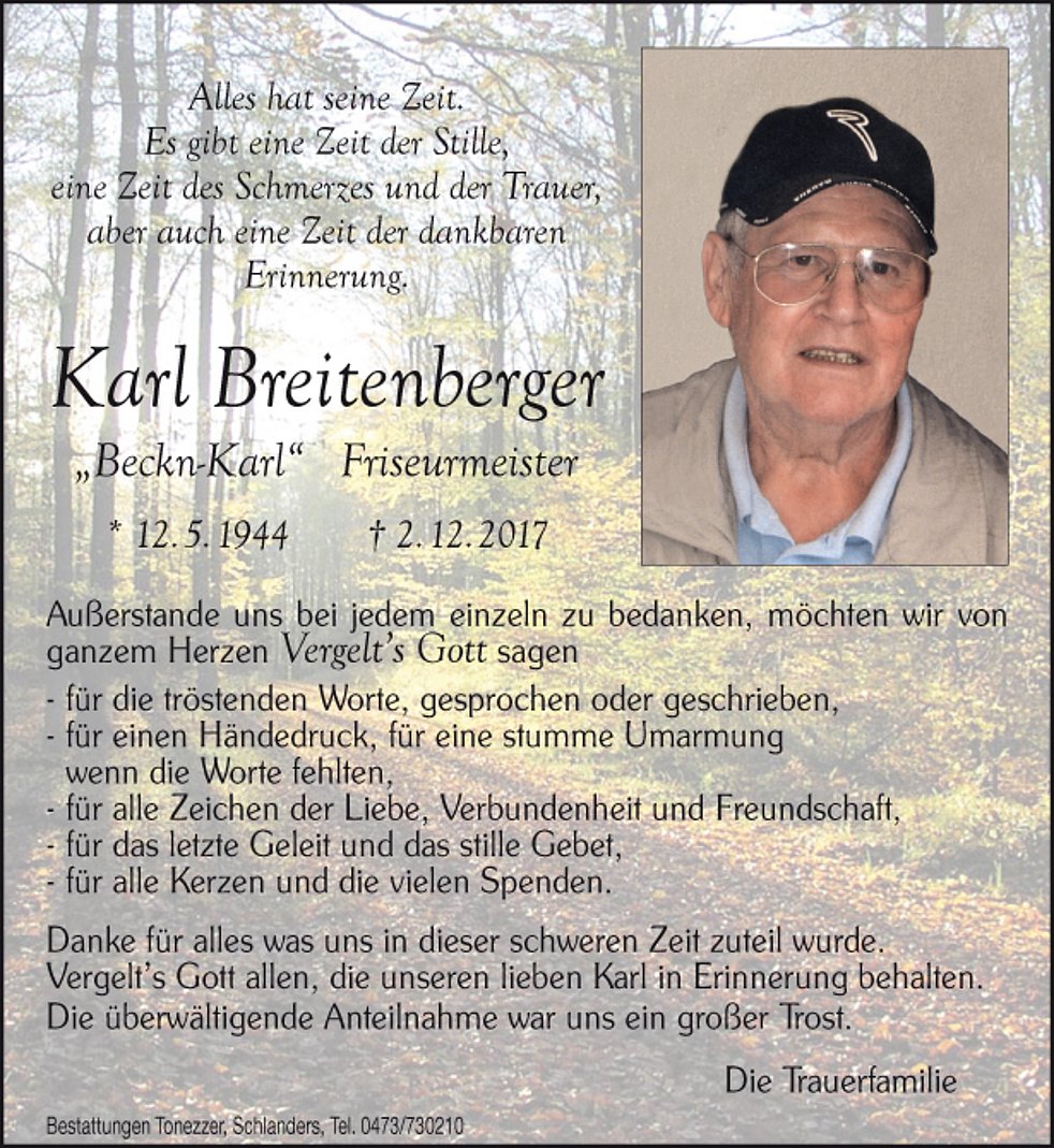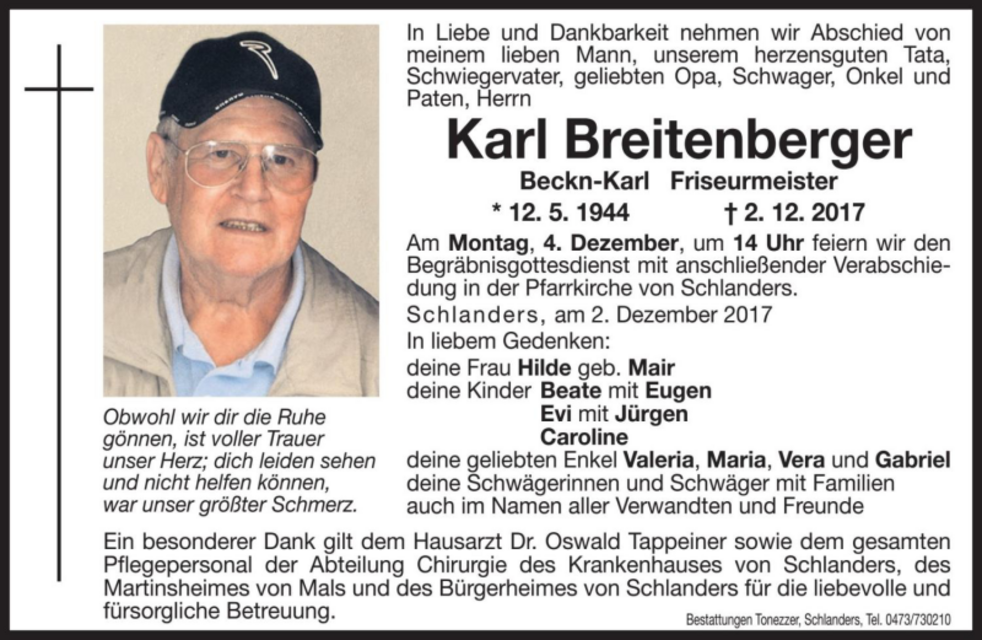 Ein besonderer Dank gilt dem Hausarzt Dr. Oswald Tappeiner sowie dem gesamten Pflegepersonal der Abteilung Chirurgie des Krankenhauses von Schlanders, des Martinsheimes von Mals und des Bürgerheimes von Schlanders für die liebevolle und fürsorgliche Betreuung.