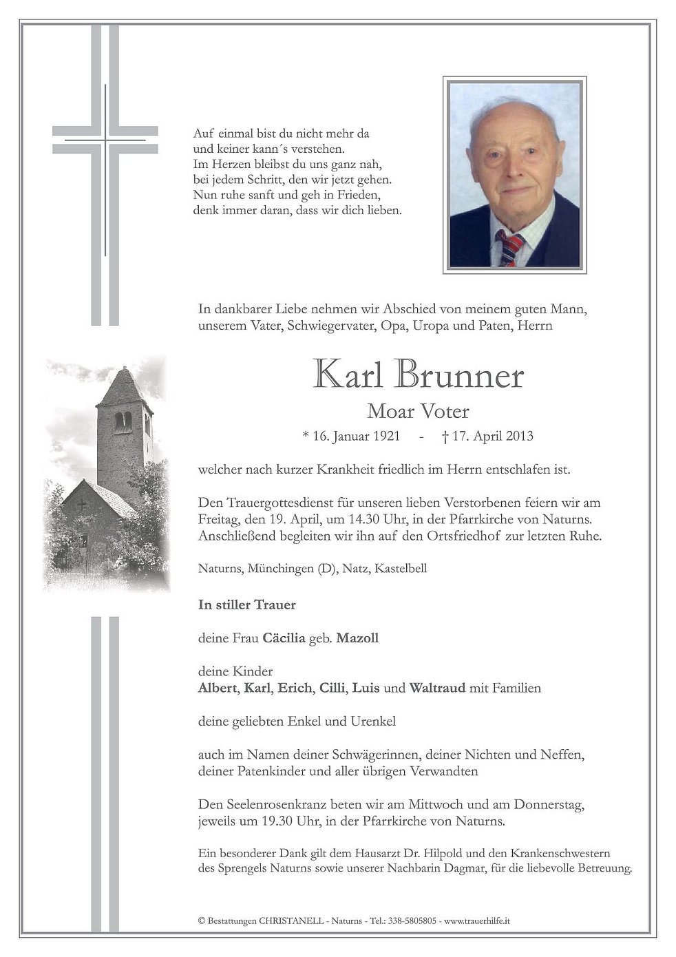 Den Trauergottesdienst für unseren lieben Verstorbenen feiern wir am Freitag, den 19. April, um 14.30 Uhr, in der Pfarrkirche von Naturns. Anschließend begleiten wir ihn auf den Ortsfriedhof zur letzten Ruhe.