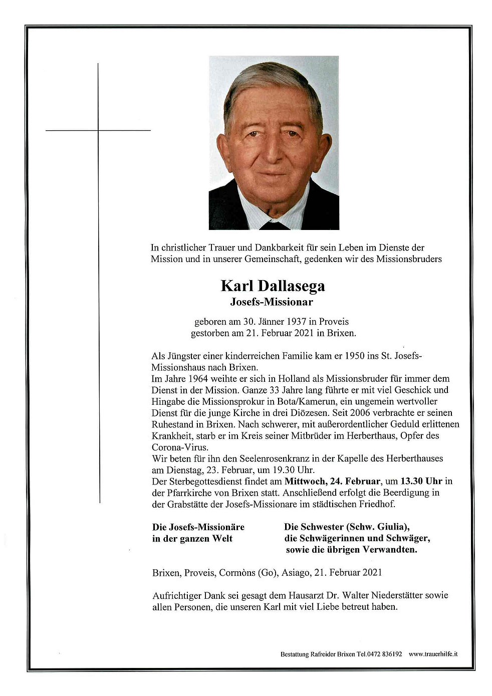 Der Sterbegottesdienst findet am Mittwoch, 24. Februar, um 13.30 Uhr in der Pfarrkirche von Brixen statt. Anschließend erfolgt die Beerdigung in der Grabstätte der Josefs-Missionare im städtischen Friedhof.