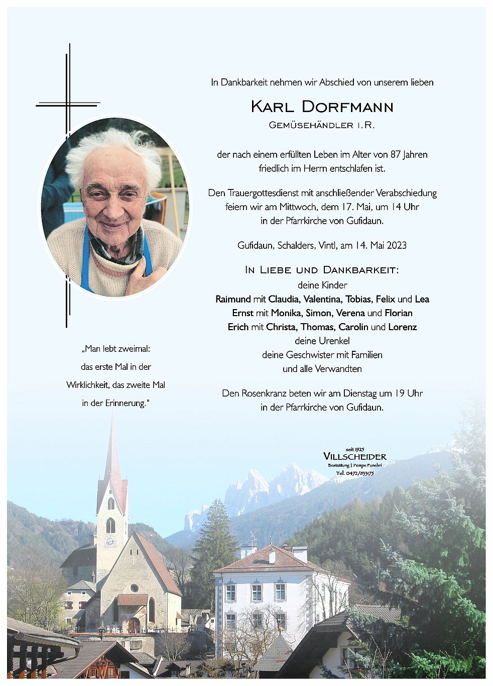 Inser Aufrichtiges Beileid zum Heimgang von enkere Tata, Karl Ruhe in Frieden, worsch a angenehmer Nochbor.