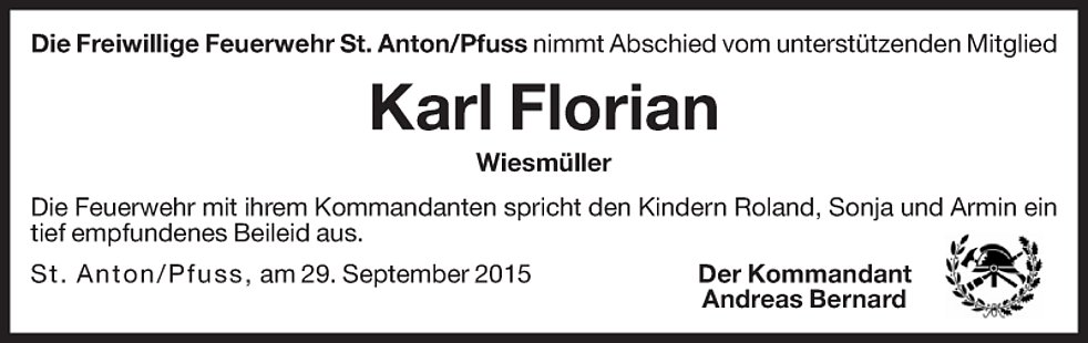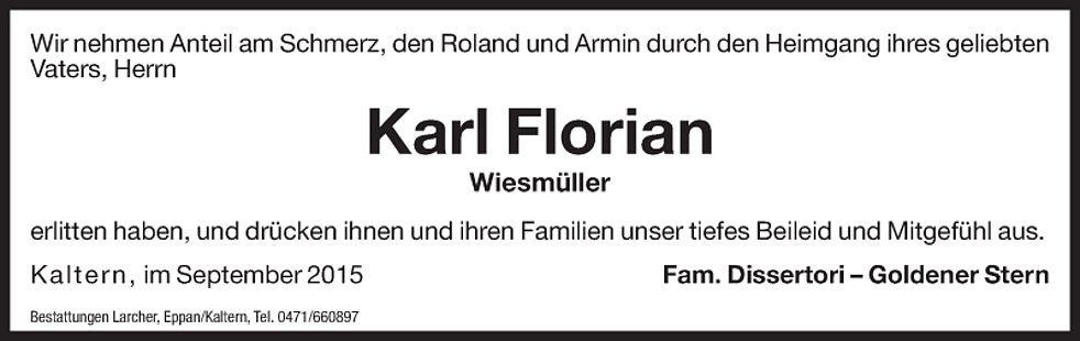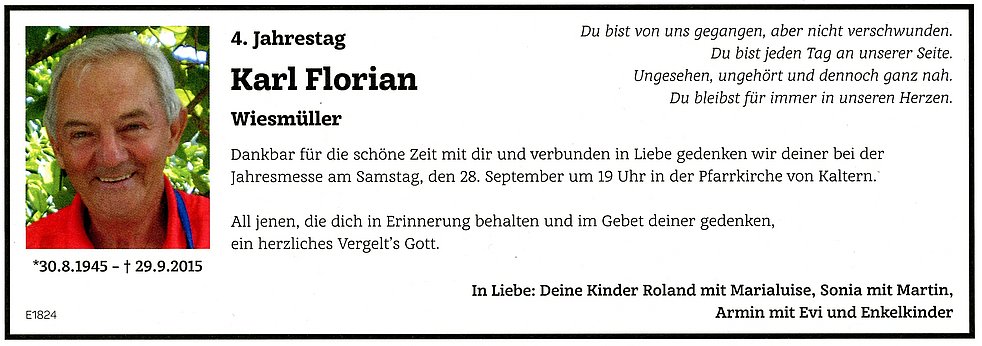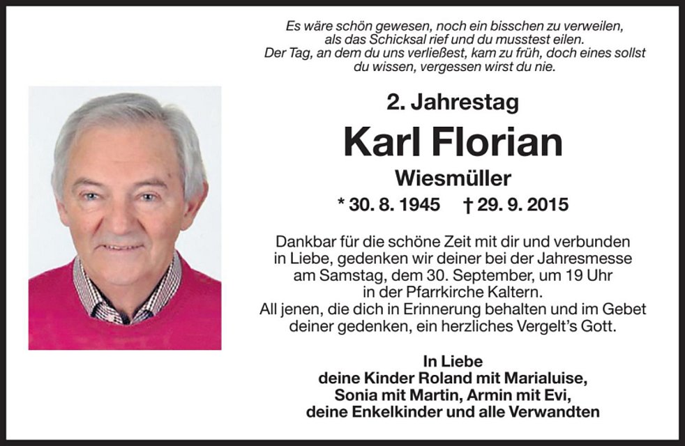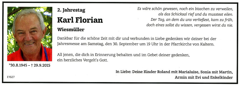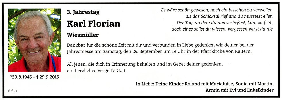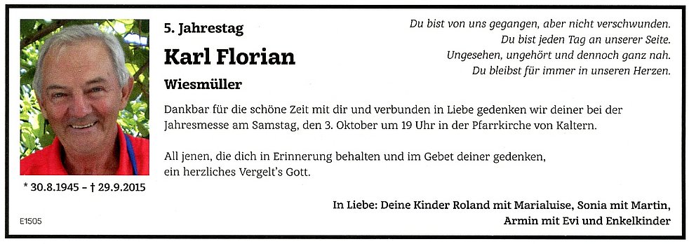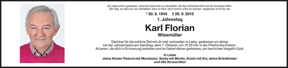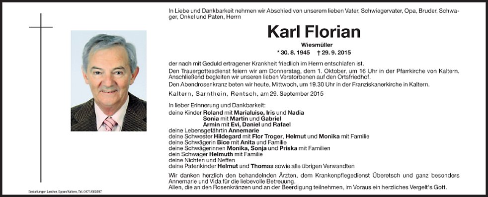 Den Trauergottesdienst feiern wir am Donnerstag, dem 1. Oktober um 16 Uhr in der Pfarrkirche von Kaltern. Anschließend begleiten wir unseren lieben Verstorbenen auf den Ortsfriedhof.