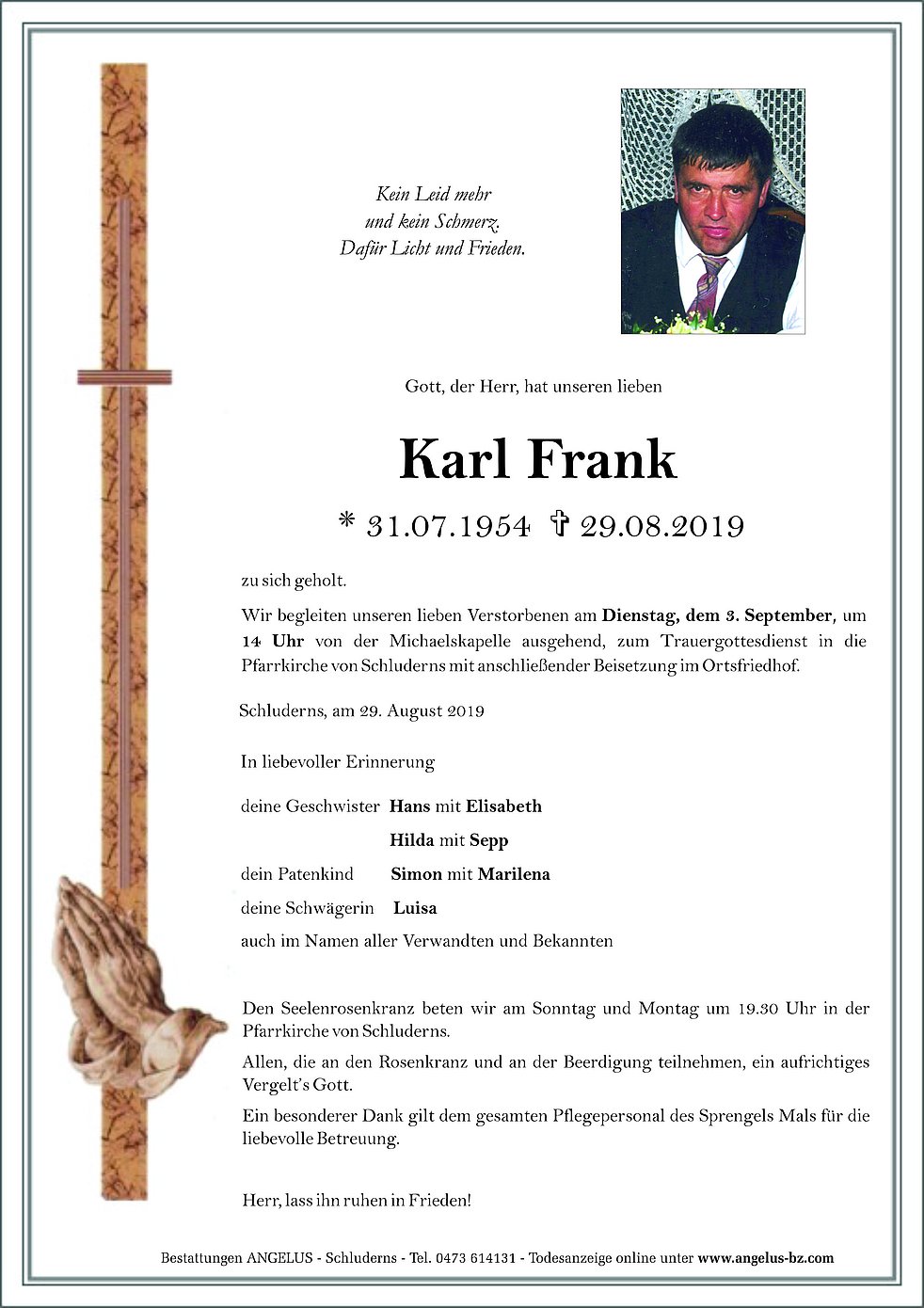 Wir begleiten unseren lieben Verstorbenen am Dienstag, dem 3. September, um 14 Uhr von der Michaelskapelle ausgehend, zum Trauergottesdienst in die Pfarrkirche von Schluderns mit anschließender Beisetzung im Ortsfriedhof.