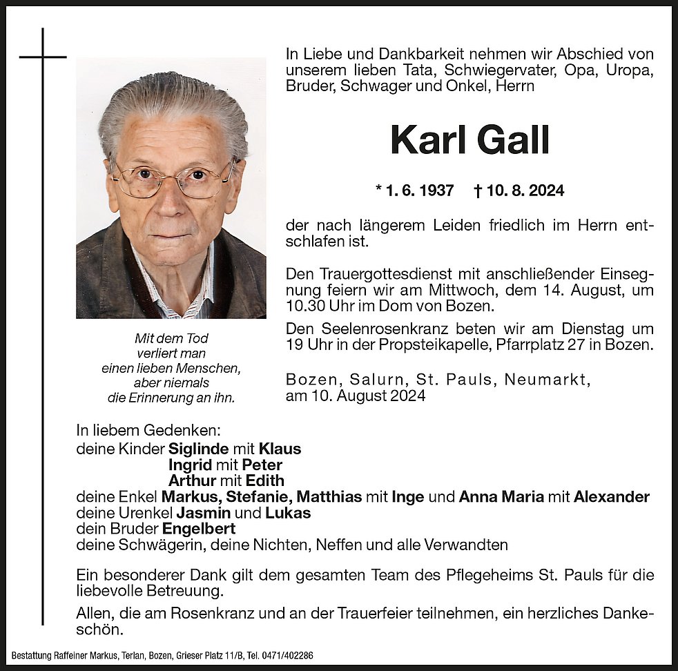 Den Trauergottesdienst mit anschließender Einsegnung feiern wir am Mittwoch, dem 14. August, um 10.30 Uhr im Dom von Bozen.