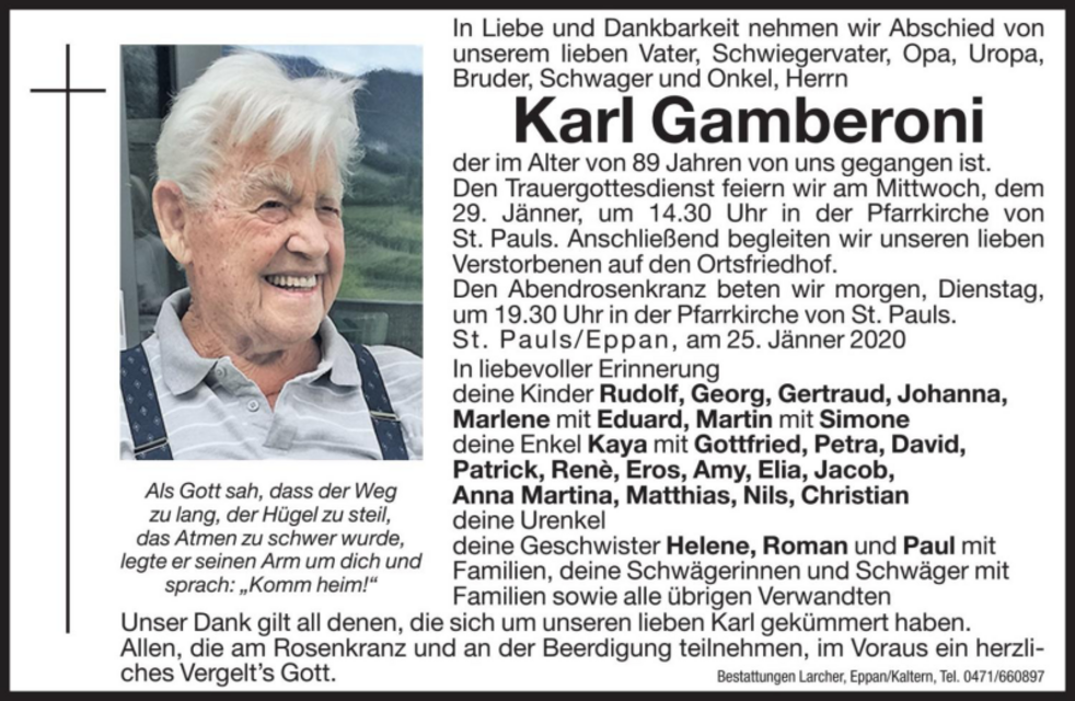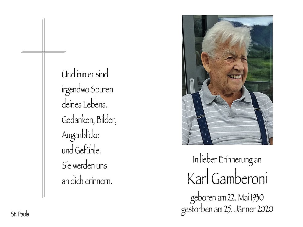 Den Trauergottesdienst feiern wir am Mittwoch, dem 29. Jänner um 14.30 Uhr in der Pfarrkirche von St. Pauls. Anschließend begleiten wir unseren lieben Verstorbenen auf den Ortsfriedhof.
