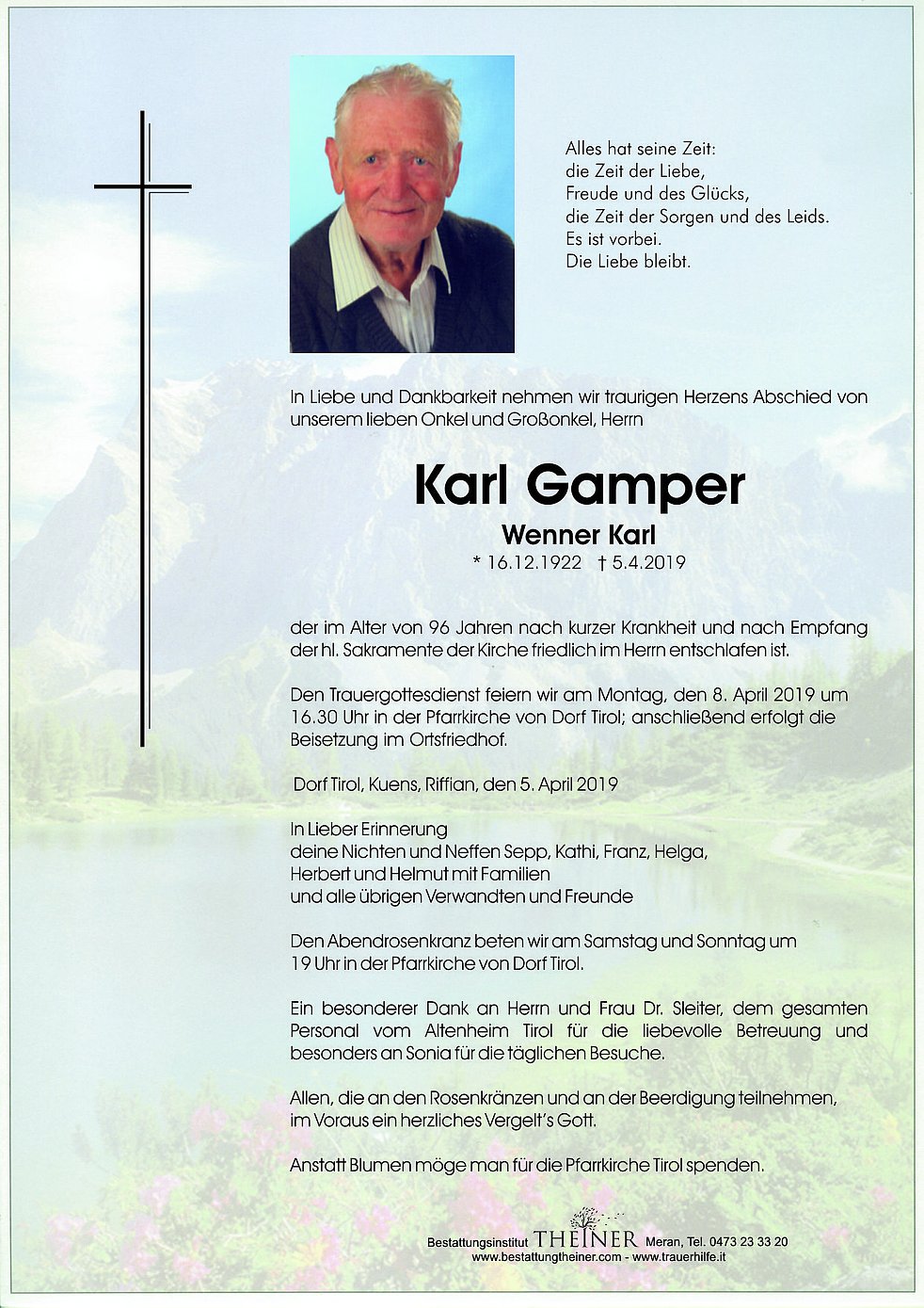 Den Trauergottesdienst feiern wir am Montag, den 8. April 2019 um 16.30 Uhr in der Pfarrkirche von Dorf Tirol; anschließend erfolgt die Beisetzung im Ortsfriedhof.