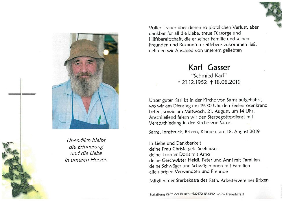 Unser guter Karl ist in der Kirche von Sarns aufgebahrt, wo wir am Dienstag um 19.30 Uhr den Seelenrosenkranz beten, sowie am Mittwoch, 21. August, um 14 Uhr.