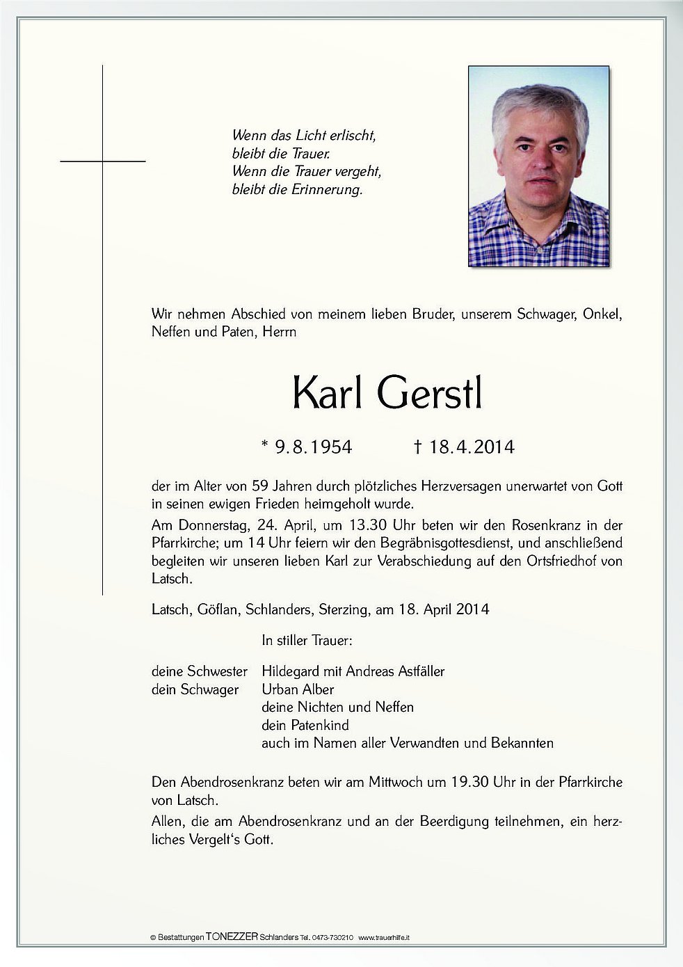 Am Donnerstag, 24. April, um 13.30 Uhr beten wir den Rosenkranz in der Pfarrkirche; um 14 Uhr feiern wir den Begräbnisgottesdienst, und anschließend begleiten wir unseren lieben Karl zur Verabschiedung auf den Ortsfriedhof von Latsch.