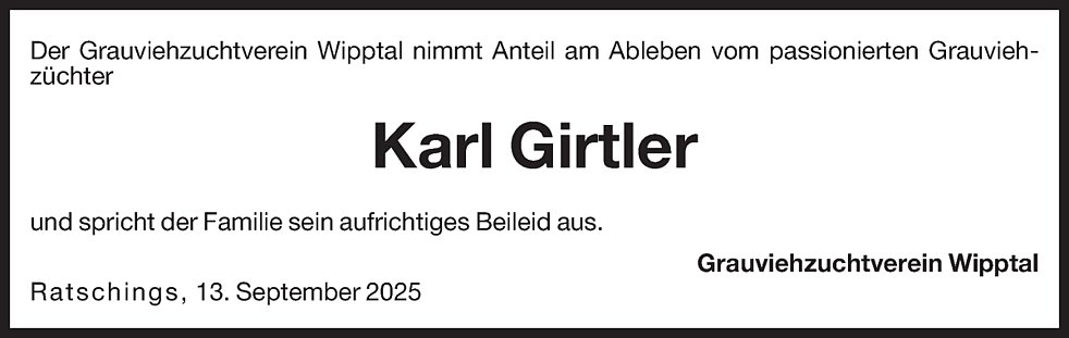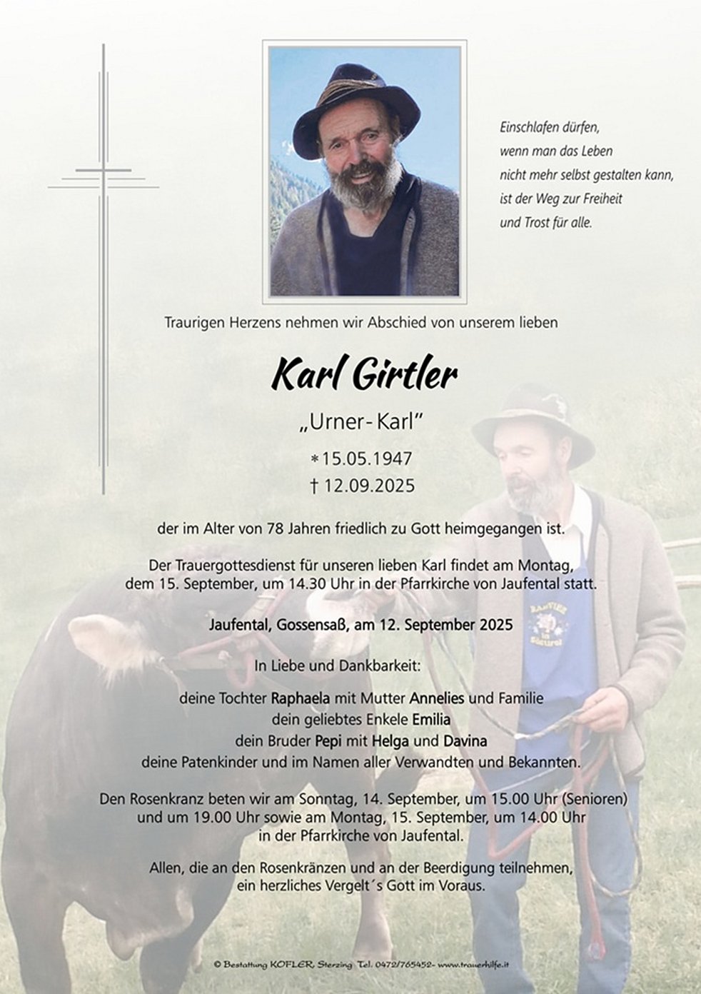 Der Trauergottesdienst für unseren lieben Karl findet am Montag, dem 15. September, um 14.30 Uhr in der Pfarrkirche von Jaufental statt.