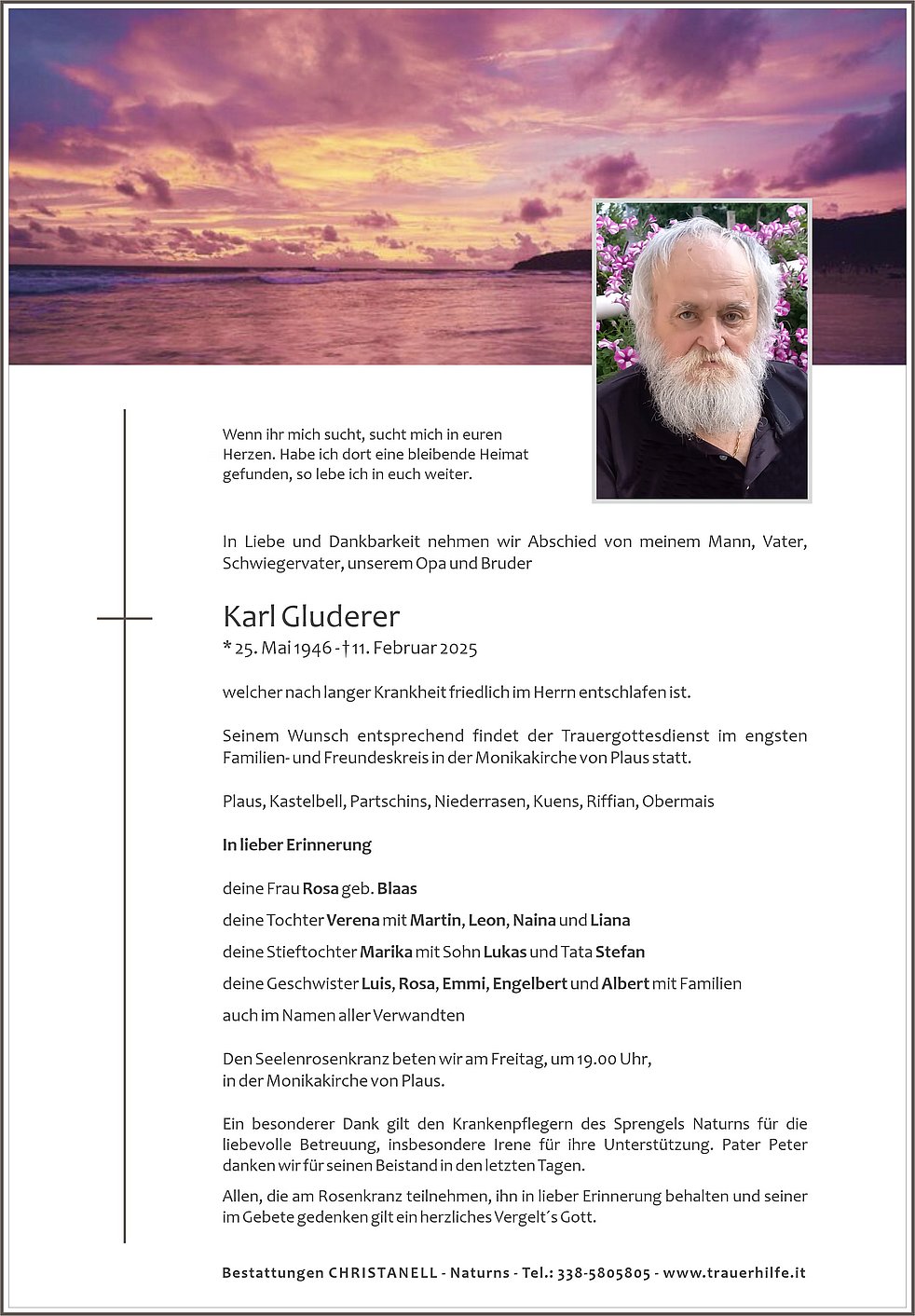 Seinem Wunsch entsprechend findet der Trauergottesdienst im engsten Familien- und Freundeskreis in der Monikakirche von Plaus statt.