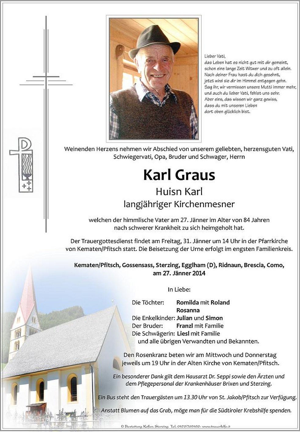 von Kematen/Pfitsch statt. Die Beisetzung der Urne erfolgt im engsten Familienkreis.